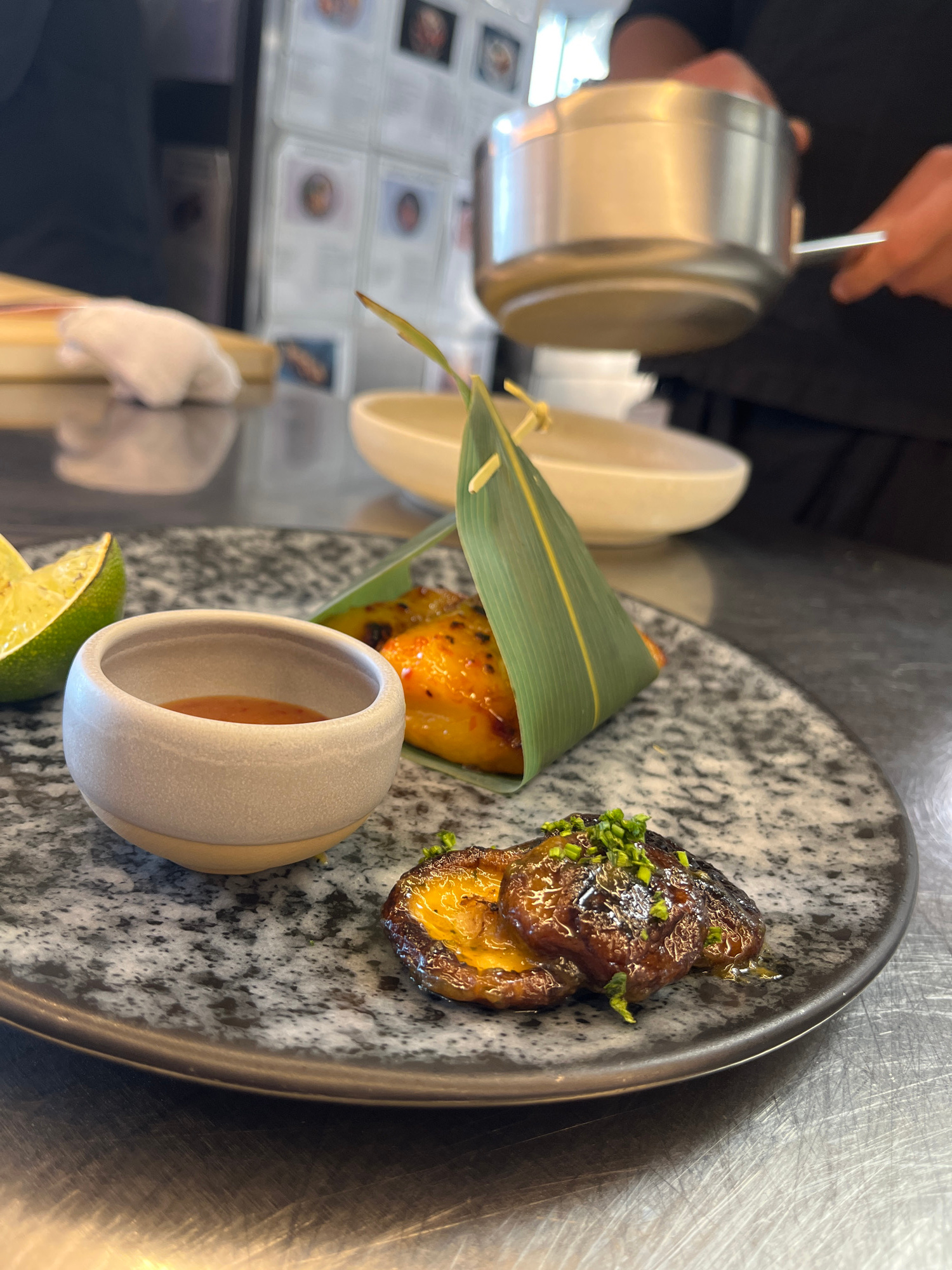 The image shows a plate of food being prepared in what appears to be a professional kitchen setting. The plate is a speckled grey and black, featuring several distinct elements: a cone-shaped object w…read more