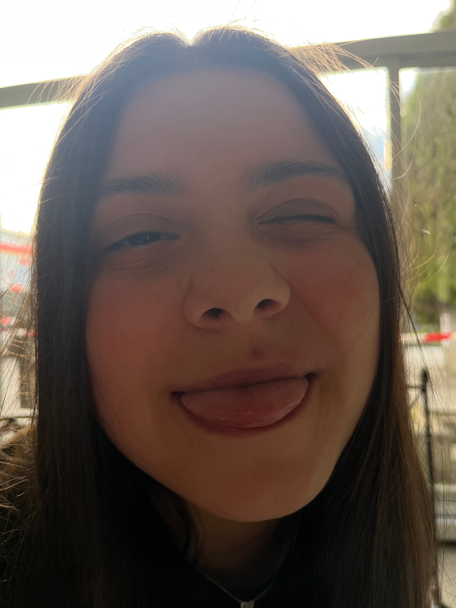 A close-up photograph shows a young woman with dark brown hair and light skin sticking out her tongue. Her eyes are mostly closed. The background includes a window with bright light. The location is p…read more