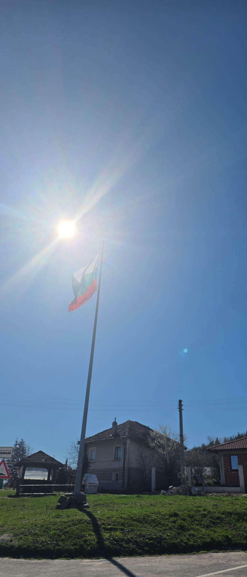 The image shows the Bulgarian flag, partially obscured by the sun, flying on a pole in Belchin, Bulgaria. A residential area is in the background, featuring houses, greenery, and a utility pole. A roa…read more