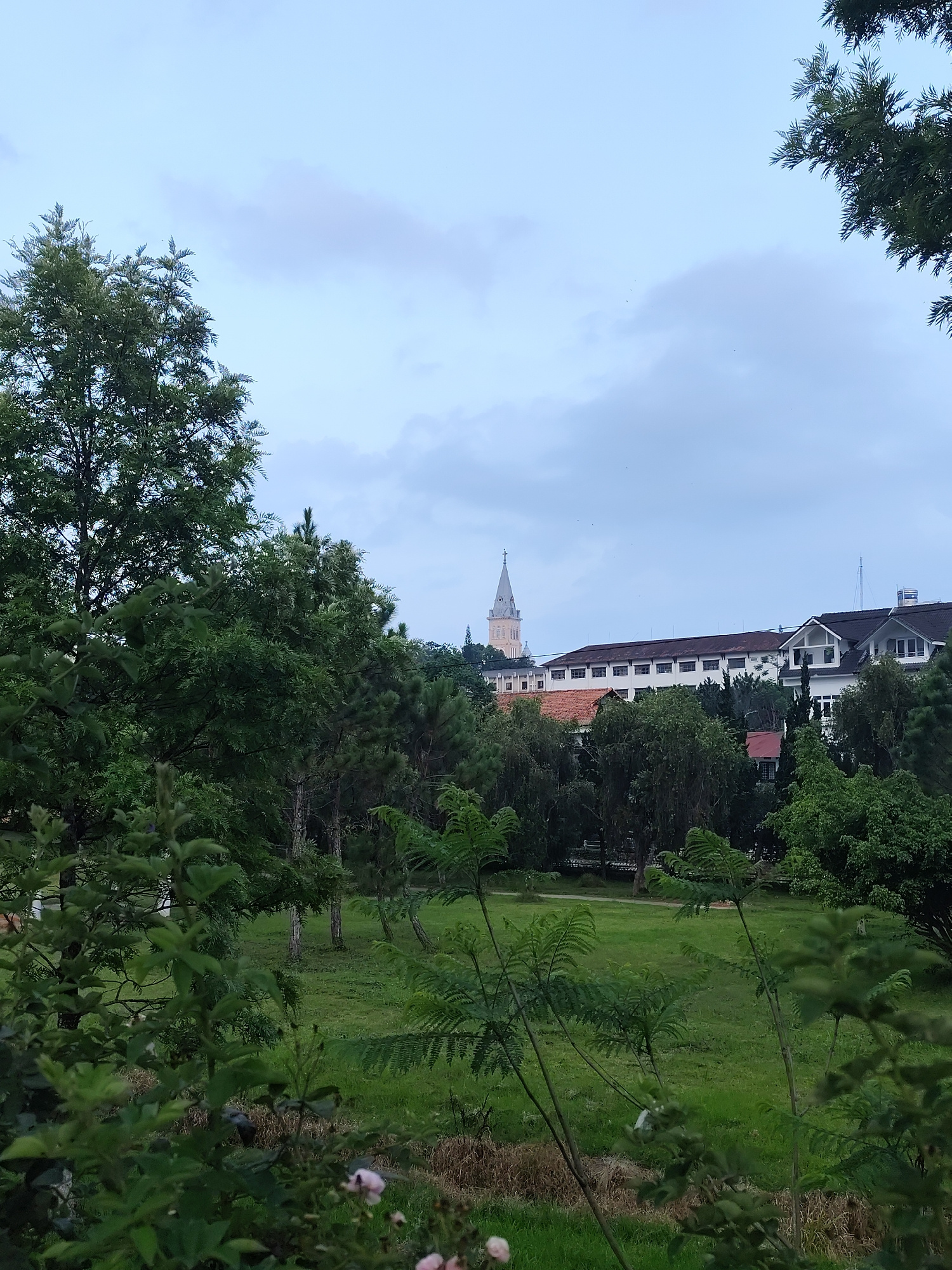 The image captures a verdant landscape in Da Lat, Vietnam. In the foreground is a grassy field with scattered young trees. Foliage from nearby trees frames the sides of the image, creating a sense ofโฆread more