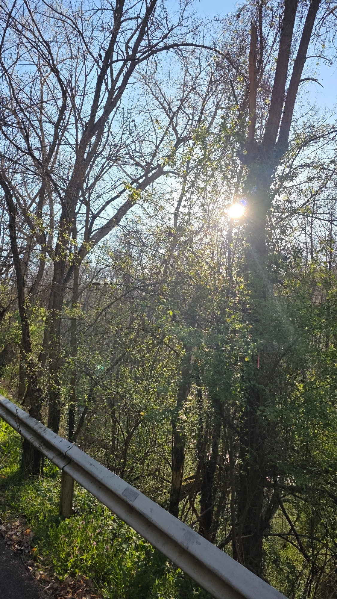 The image shows a view of a tree line with sunlight shining through the branches. A guardrail is visible in the lower right foreground. The sky is blue. The location is Blagoevgrad, Bulgaria.