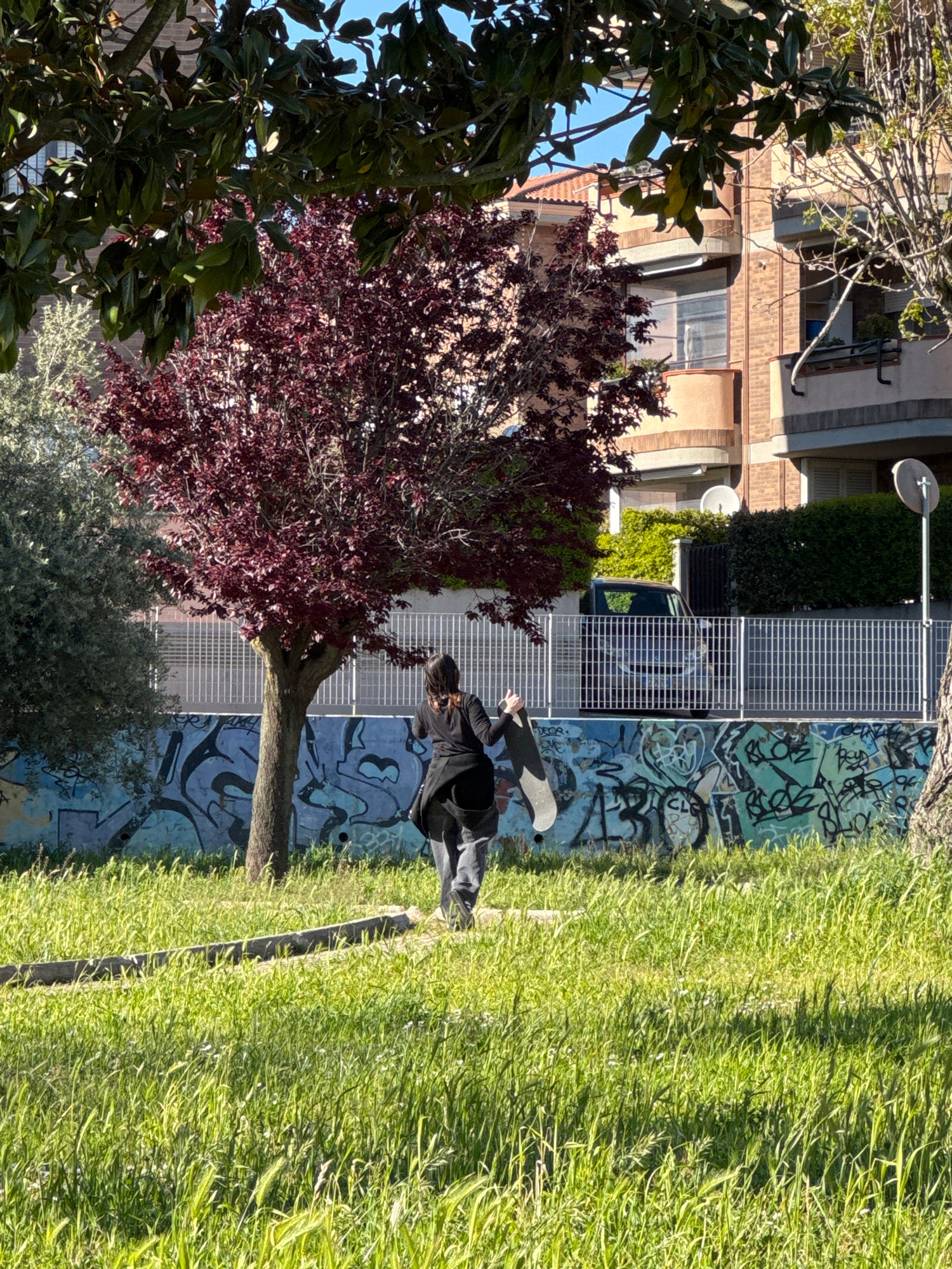 The image shows a public space in Aprilia, Italy, adjacent to a multi-story brick building. A person in dark clothing walks along a narrow strip of grassy area. The grass separates the pedestrian from…read more