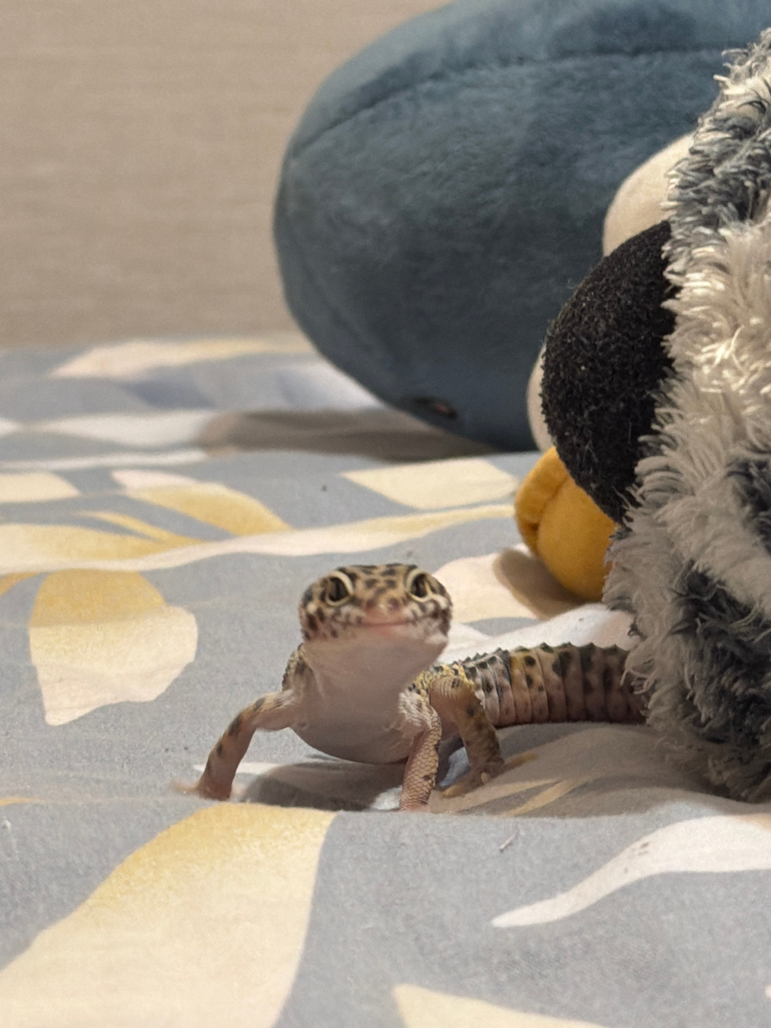 A gecko is perched on a patterned surface, possibly fabric or bedding, with part of its body obscured by a plush toy. The toy has a blue, gray, and white color scheme with a textured black patch and a…read more