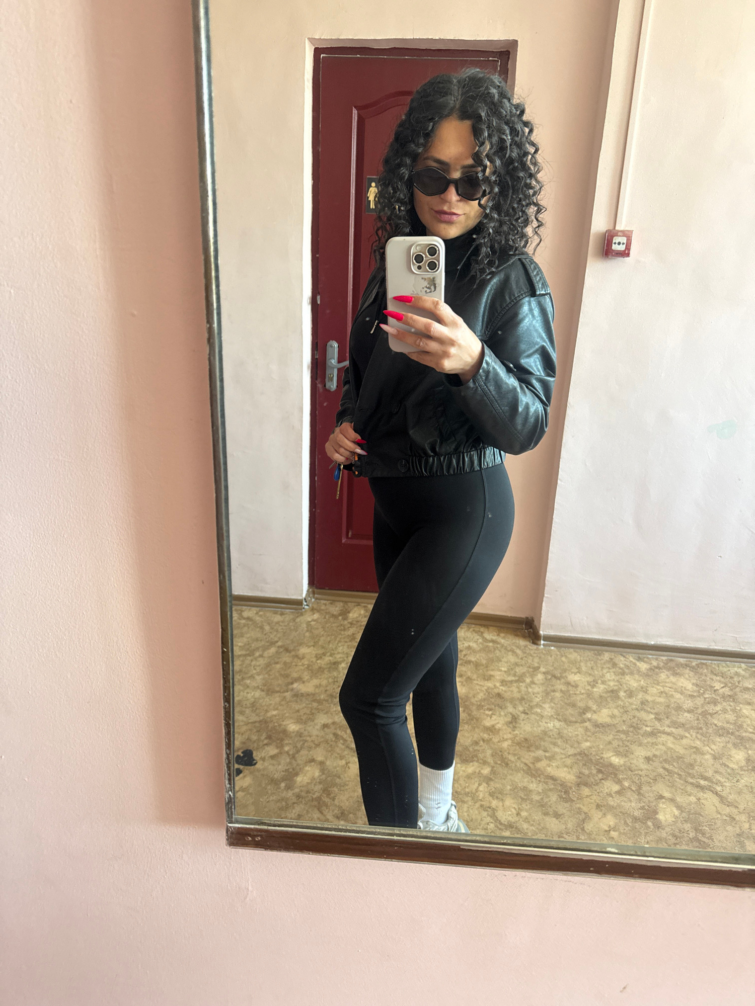 A young person is captured in a mirror selfie, standing upright and posing indoors in Chaikovsky, Russia. The individual has dark, curly hair and is wearing dark sunglasses, a black leather-style jack…read more