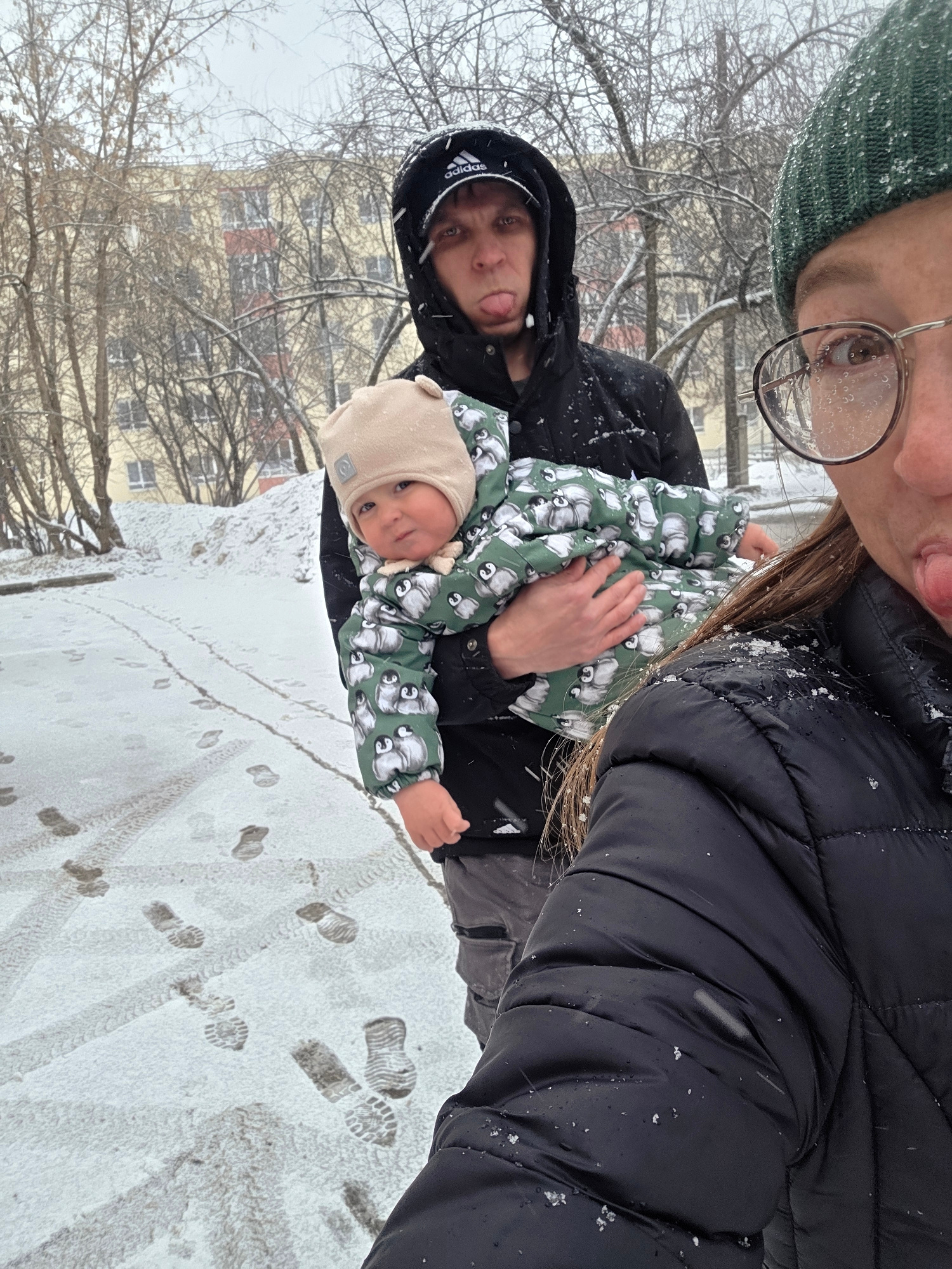 The image depicts a snowy scene, likely in the city of Chaikovsky, Russia, as indicated by metadata not included in the request. A family, consisting of two adults and a young child, appears to be out…read more