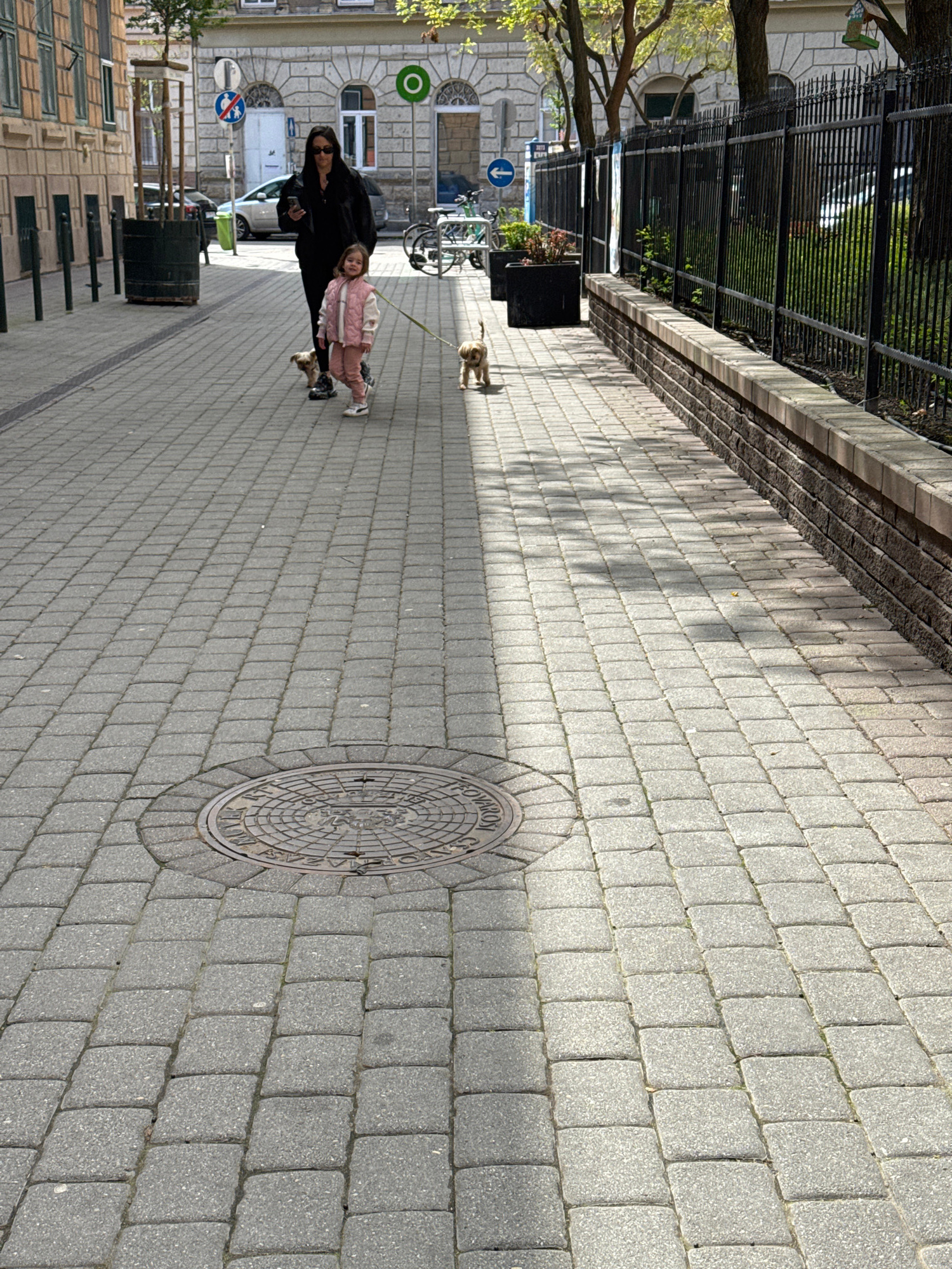 A woman in a black jacket and sunglasses walks with a young girl in a pink jacket on a cobblestone street in Budapest, Hungary. Both are holding onto a leash attached to one of the two small dogs. A manhole cover with Hungarian text is visible on the right side of the street. A black fence runs along the edge of the street, bordering a stone building. Trees and buildings are in the background. The street is well-lit with shadows cast by trees or buildings. | Open Wire