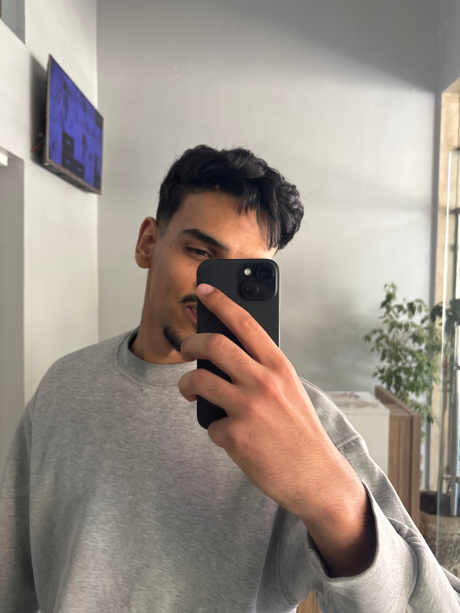 A man in a grey sweatshirt is taking a selfie in what appears to be a modern indoor setting. He is holding a black smartphone with a dual-lens camera in his right hand, obscuring part of his face. His…read more
