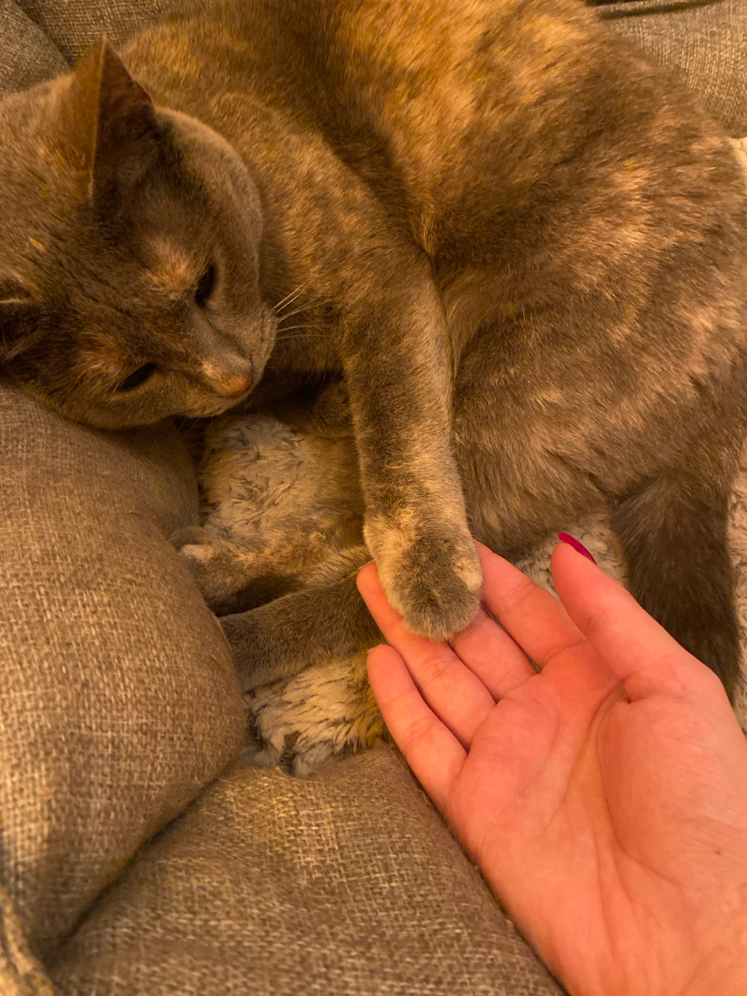 A domestic cat rests in a pet bed, with a human hand gently touching its paw. The cat is a mix of gray and brown, curled up in a relaxed position with its eyes closed. The human hand is light-skinned…read more
