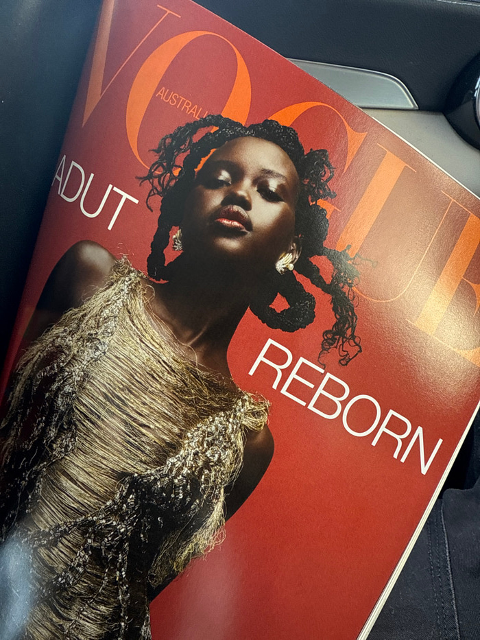 In the city of Los Angeles, United States of America, a "Vogue Australia" magazine is positioned diagonally within the interior of a vehicle. The cover features a dark-skinned woman, likely model Adut…read more