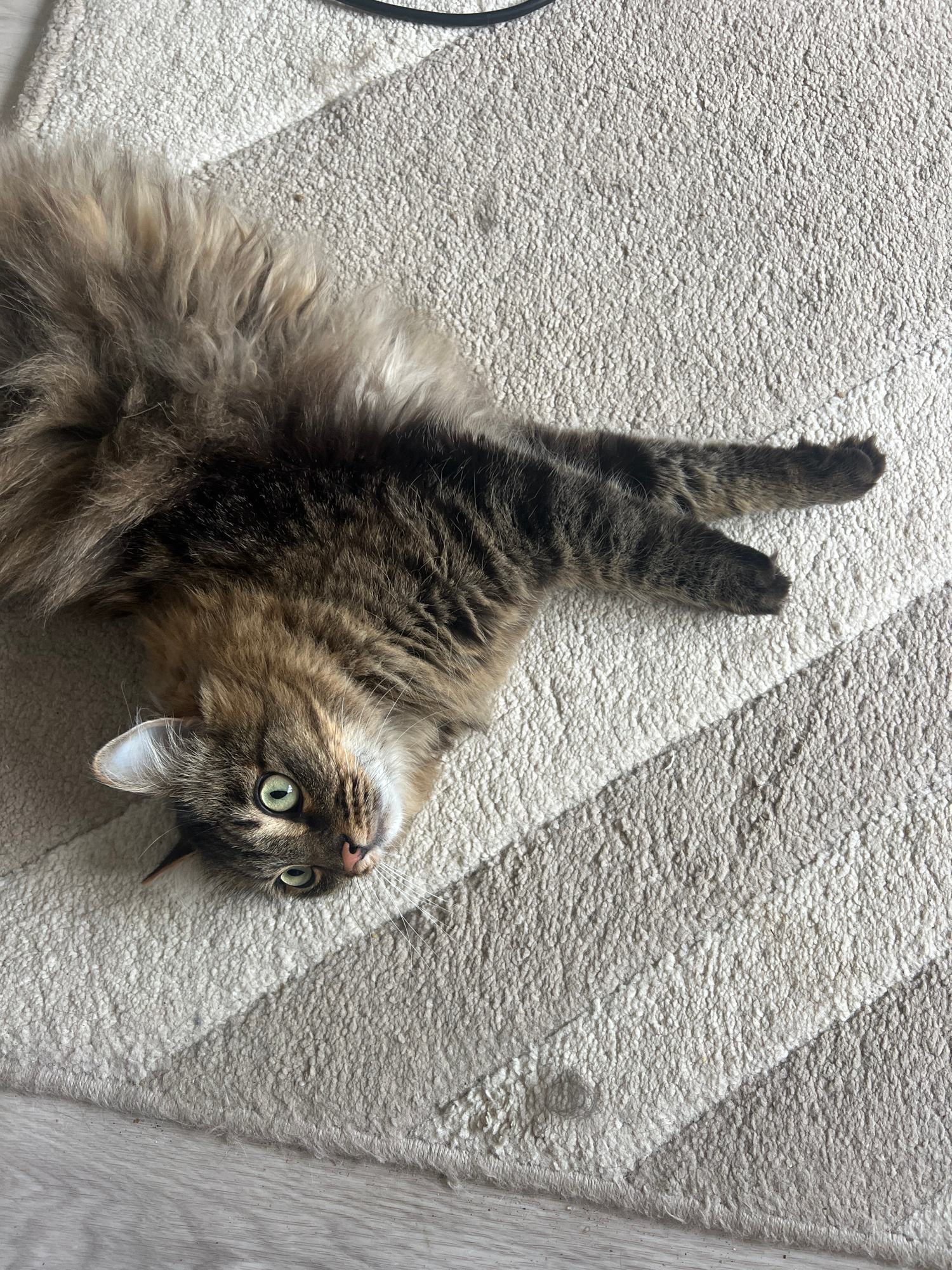 A fluffy brown tabby cat lies on its back on a light gray textured rug with its paws extended upwards. The cat has striking green eyes and a light pink nose. The edge of a light wood floor is visible…read more