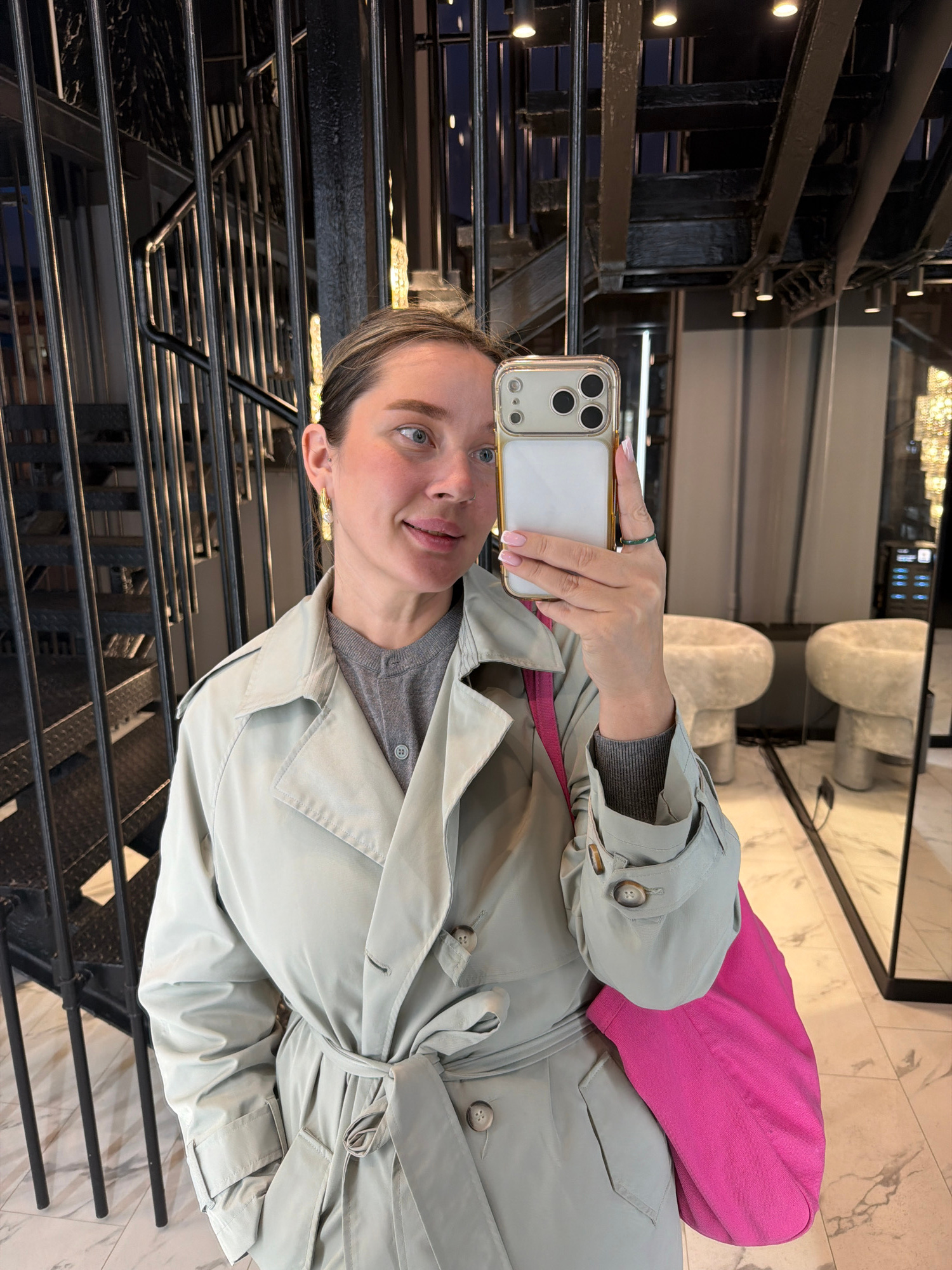 A woman is taking a selfie in what appears to be an urban setting, potentially a building with unique architectural features. She is wearing a light-colored trench coat over a gray top and seems to be…read more