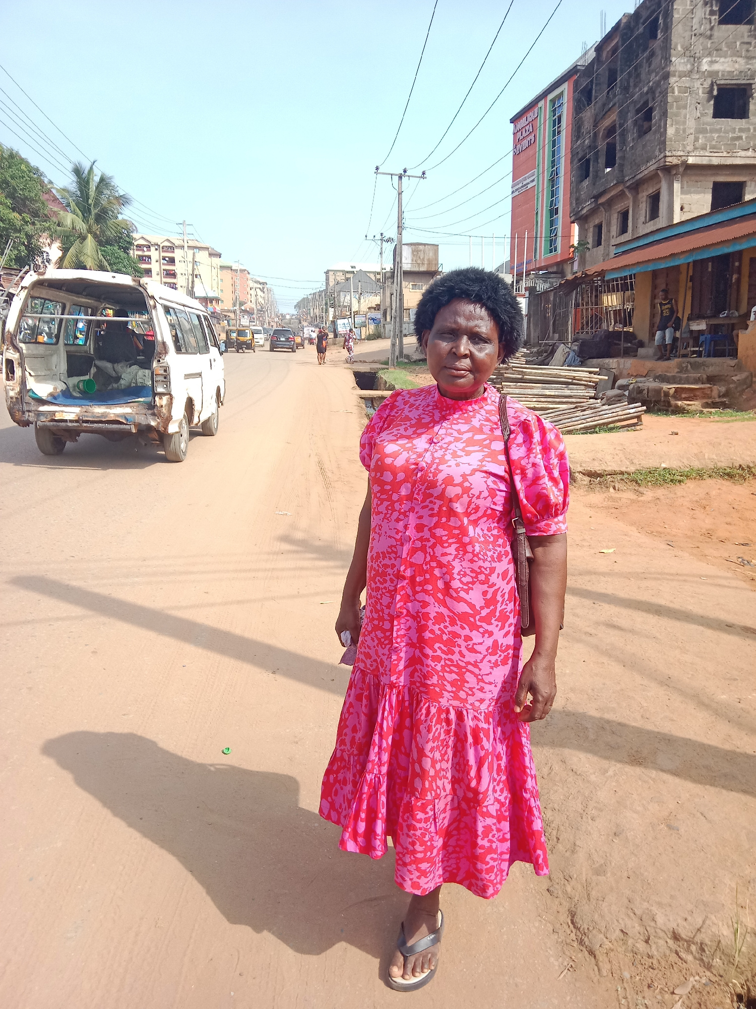 The photo depicts a woman standing on a dirt road in Onitsha, Nigeria. She is wearing a pink and red patterned dress and sandals, and carrying a brown purse over her shoulder. Behind her is a street w…read more