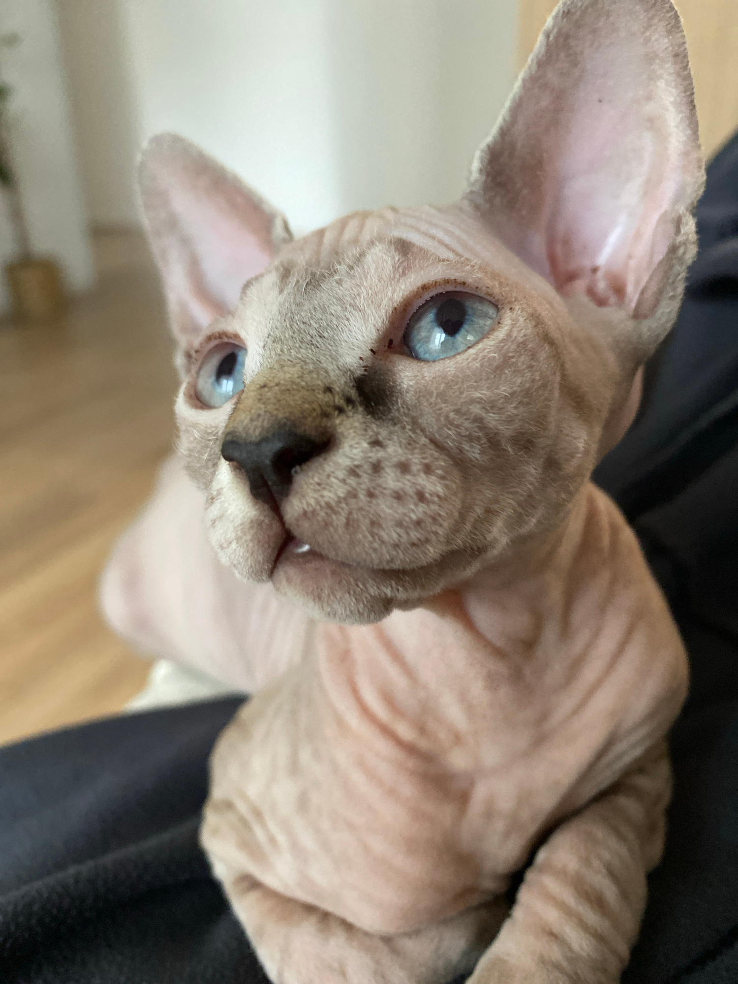 A close-up, high-angle shot features a hairless cat with light blue eyes and prominent ears. The cat's skin appears wrinkled and pinkish-gray in tone. The nose is dark, and a single tooth is visible.…read more