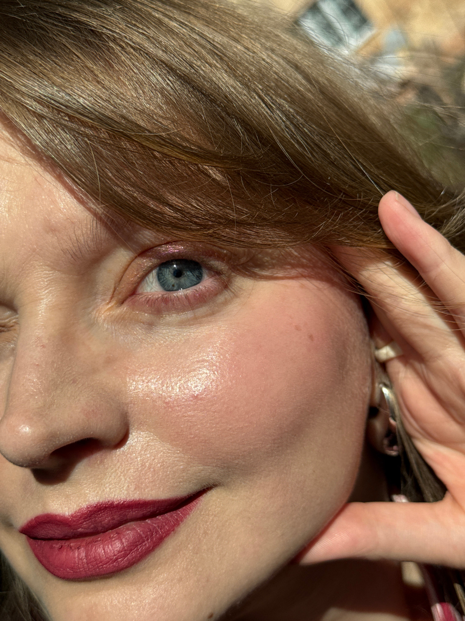 A close-up, tilted, indoor shot focuses on a person's face and hand. The individual has fair skin, light brown hair, and a single visible blue eye. Their lips are painted a dark, reddish-purple color.…read more