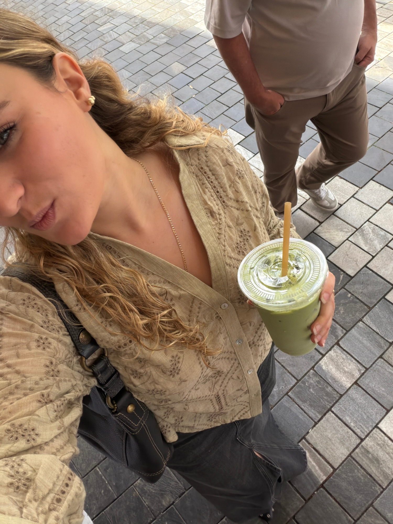 The image shows a first-person perspective selfie. A woman with blonde hair and a gold necklace is holding a green iced drink with a straw. She is wearing a light-colored, patterned shirt, and a black…read more