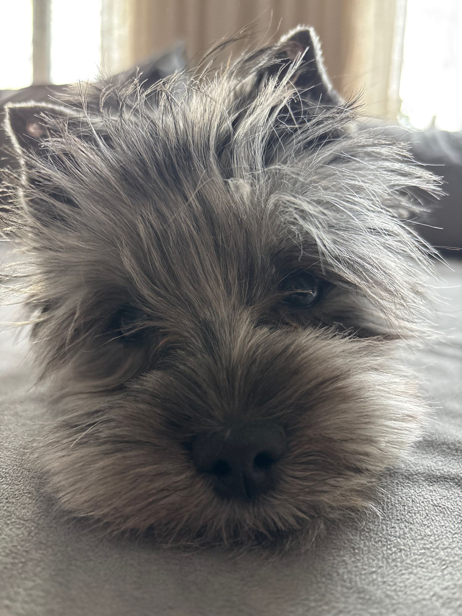 A close-up photograph shows the head of a gray, furry dog with a black nose. The dog is lying on a gray fabric surface. Sunlight is visible in the background to the left, passing through window blinds…read more