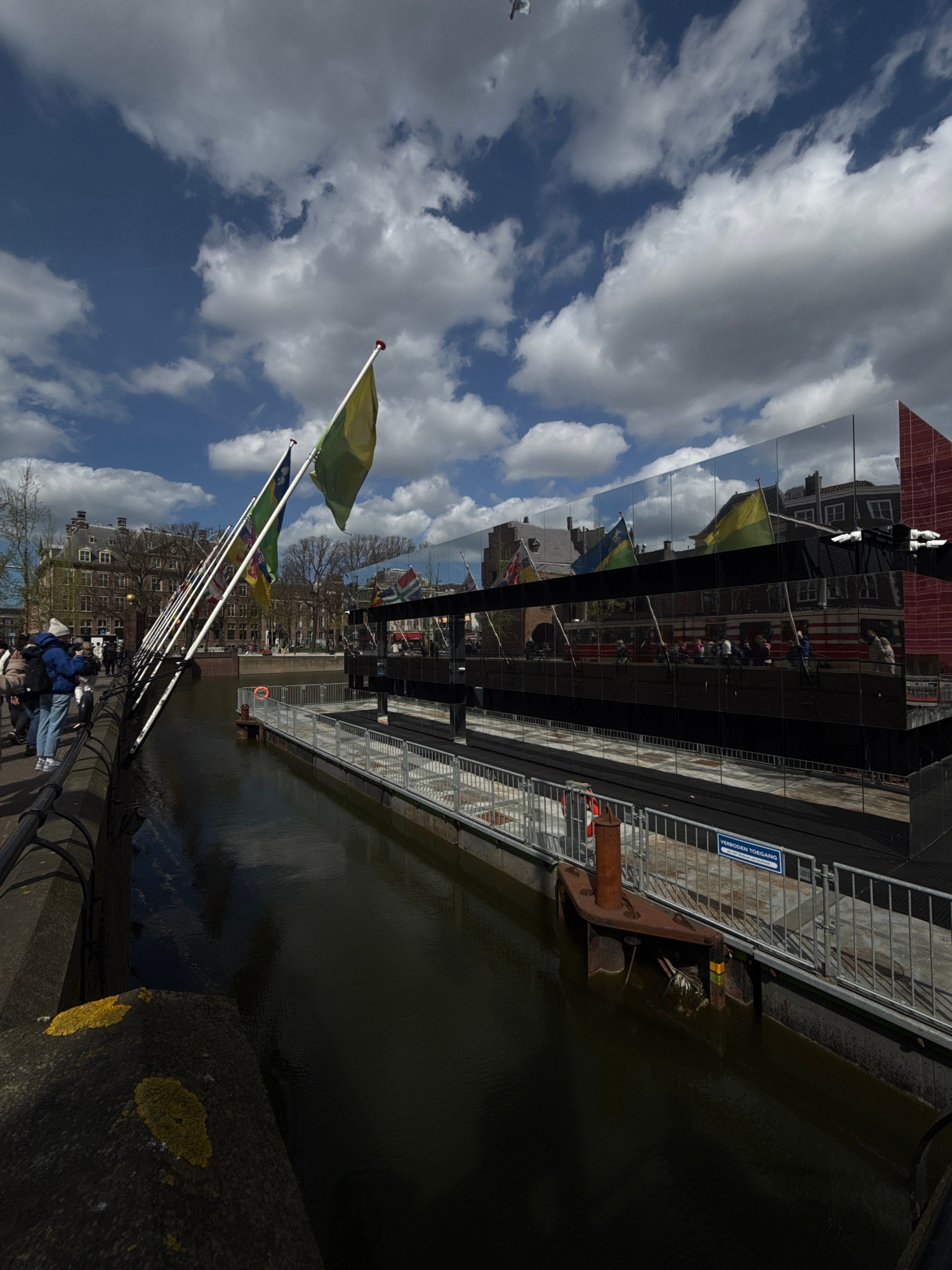 The image shows a canal scene in The Hague, Netherlands, on a partly cloudy day. A modern, rectangular building with mirrored walls is situated along the canal, reflecting the sky and nearby buildings…read more