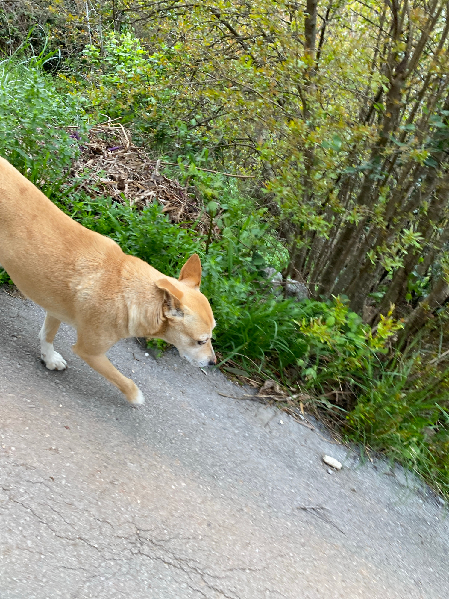 An eye-level medium shot shows a medium-sized, tan-colored dog with white paws on a cracked asphalt sidewalk in a wooded area, likely in Budva, Montenegro. The dog faces away from the viewer, toward t…read more