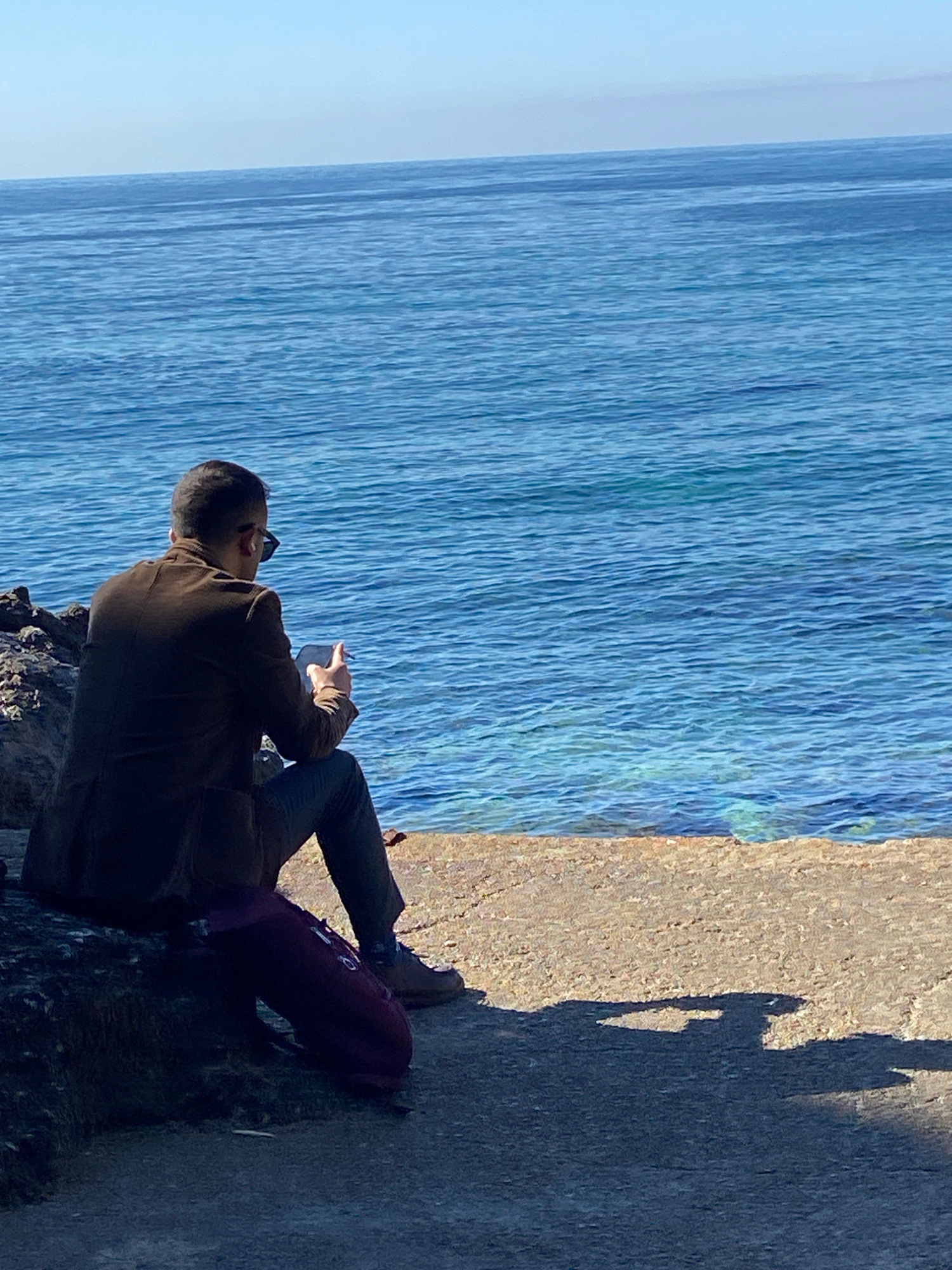 A man sits on a rocky ledge overlooking a body of water. The man is wearing sunglasses, a dark jacket, and dark pants. He is holding a phone in his hand, possibly taking a picture of the sea. A maroon…read more