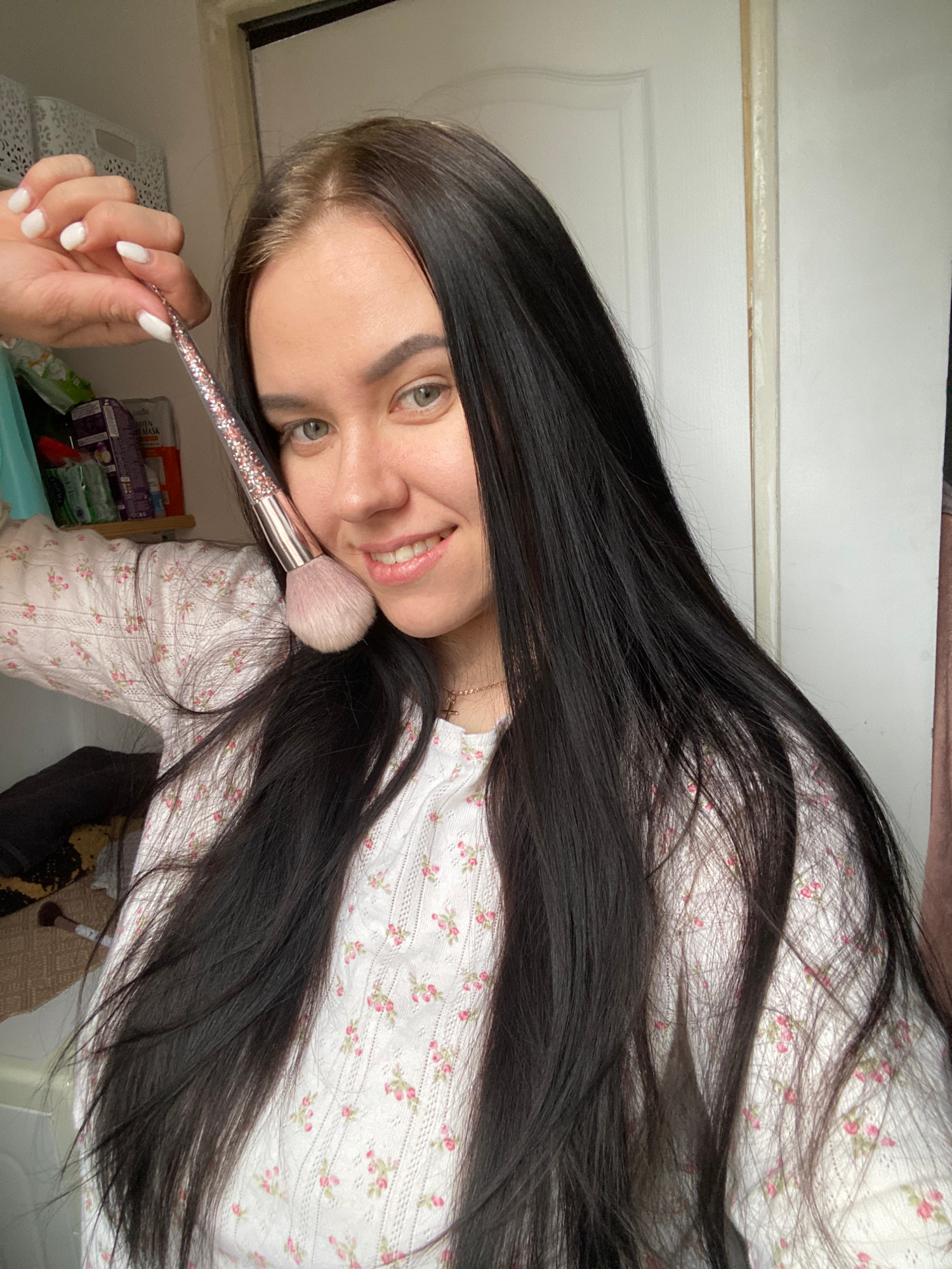 A woman with long, dark hair is holding a large makeup brush in her right hand, positioning the brush's head against her cheek. She is smiling and looking at the camera. She is wearing a light-coloredβ¦read more