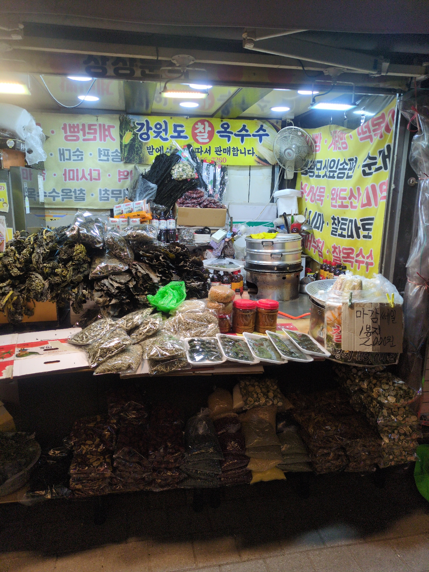 The image shows a street stall in Seoul, South Korea, selling various dried goods and prepared foods. There are multiple signs with Korean text advertising the products, including "Gangwon-do corn" an…read more