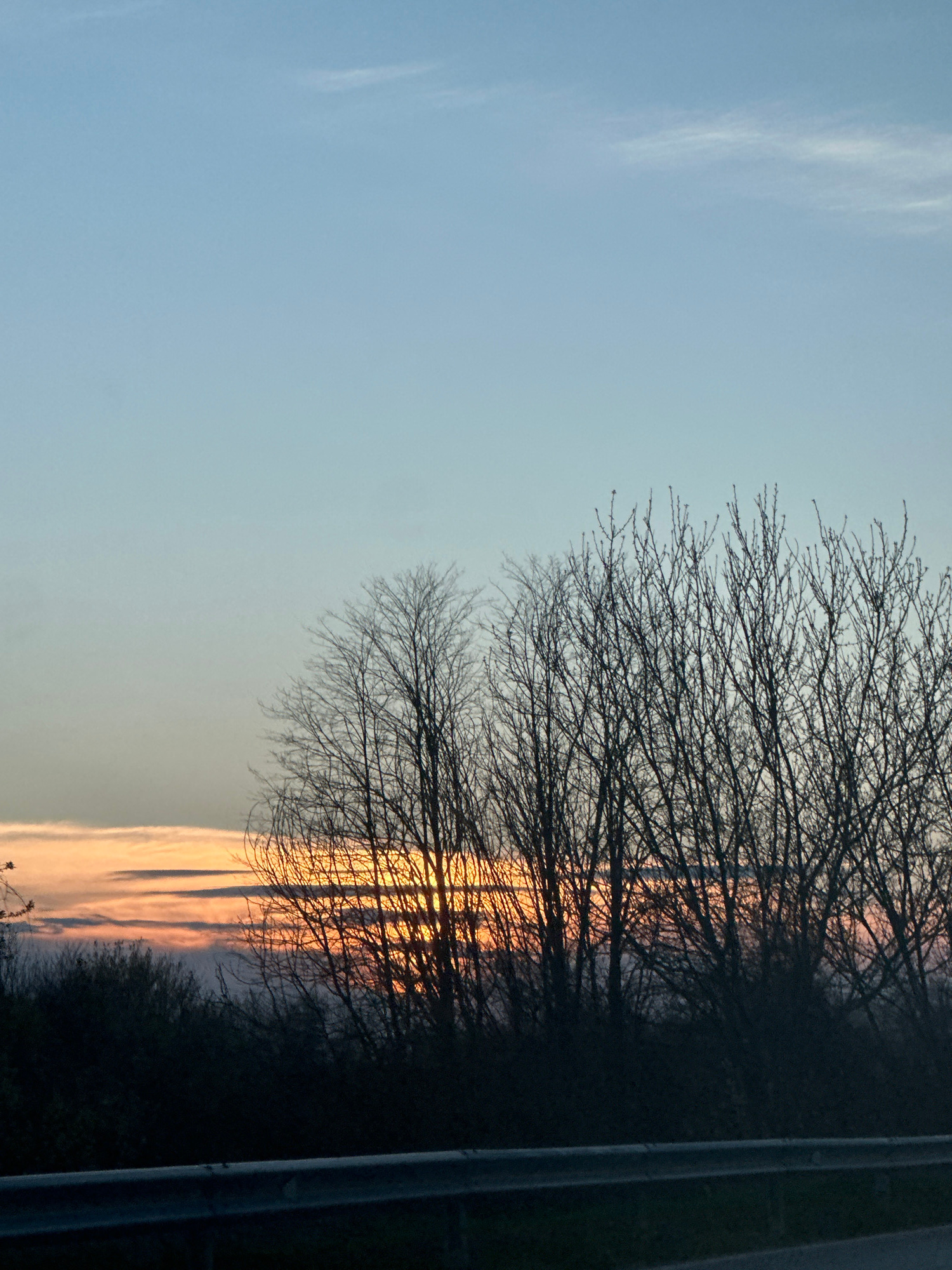 The image depicts a scene at dusk or dawn. A leafless tree occupies the center of the frame, its branches silhouetted against a light orange and grey sky. The sky transitions into a light blue towardsβ¦read more
