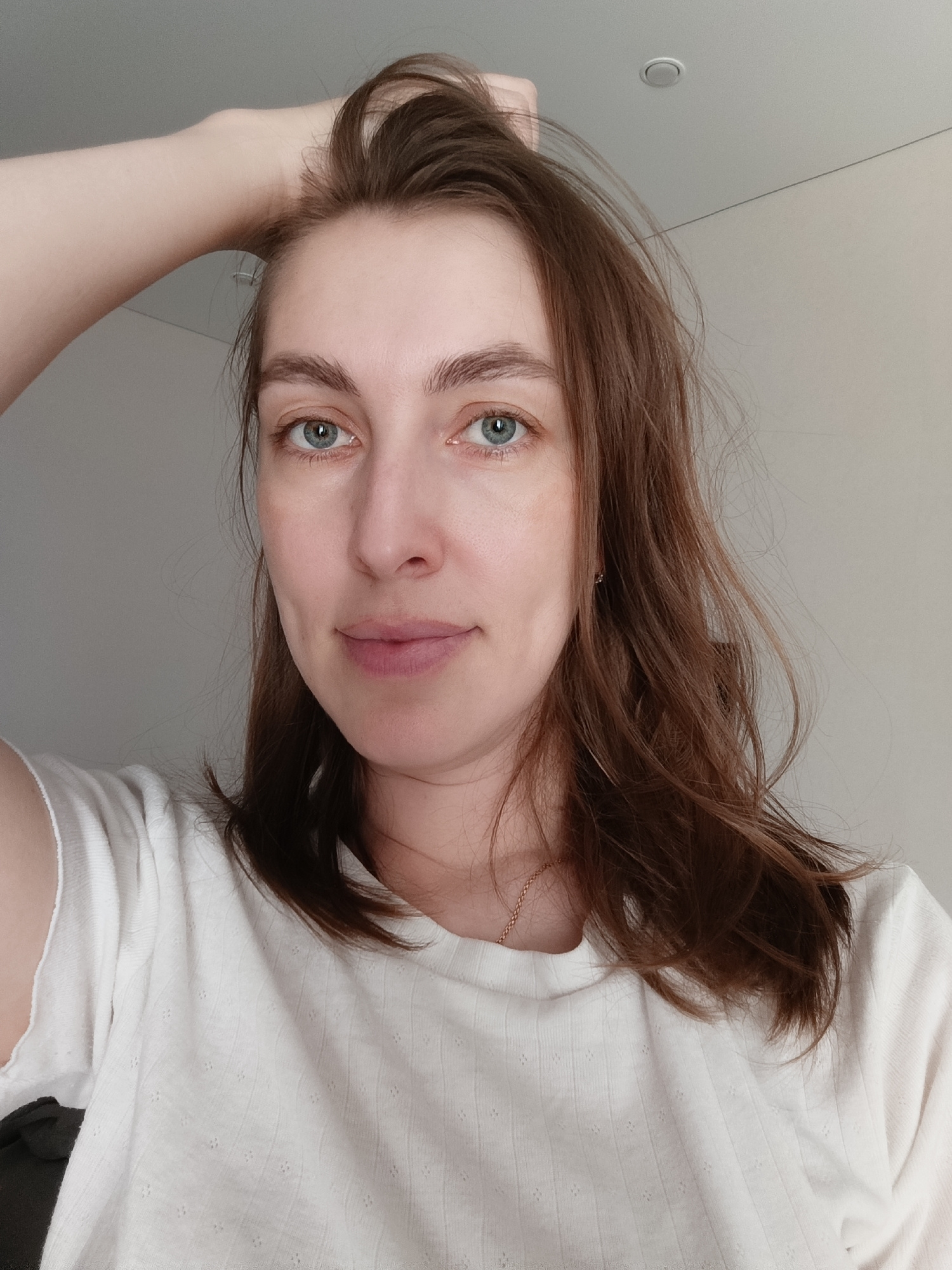 A woman with brown hair and blue eyes is taking a selfie indoors. She is wearing a white t-shirt. Her left hand is running through her hair. The background is a plain white wall with a recessed lighti…read more