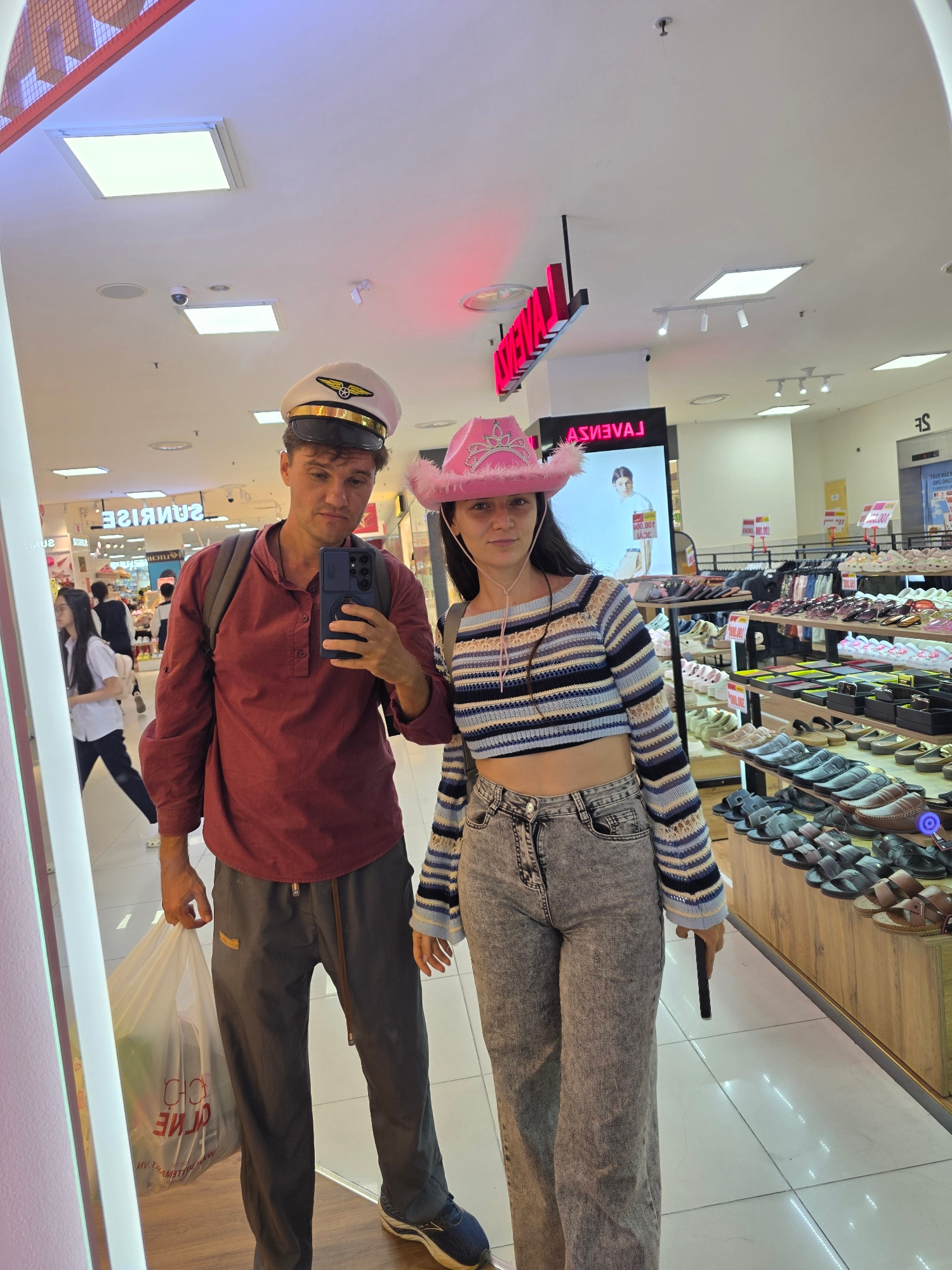 The image shows a mirror reflection of two people posing in what appears to be a shopping mall. The man is wearing a captain's hat, a red shirt, and dark pants, holding a phone in one hand and a shopp…read more