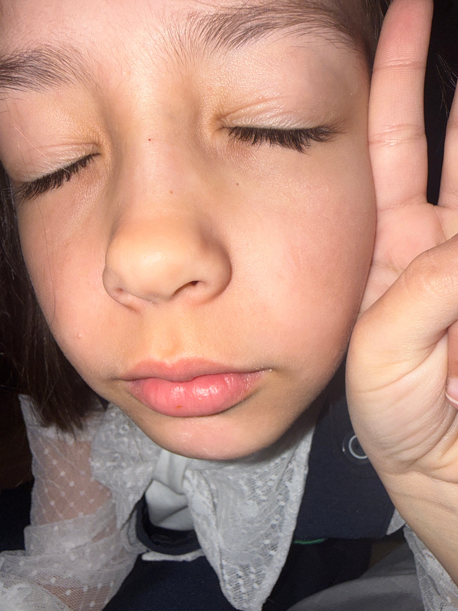 The image shows a close-up of a child's face in repose. The child's eyes are closed, and a hand is positioned above their forehead. The skin appears smooth and fair, with visible eyelashes and eyebrow…read more