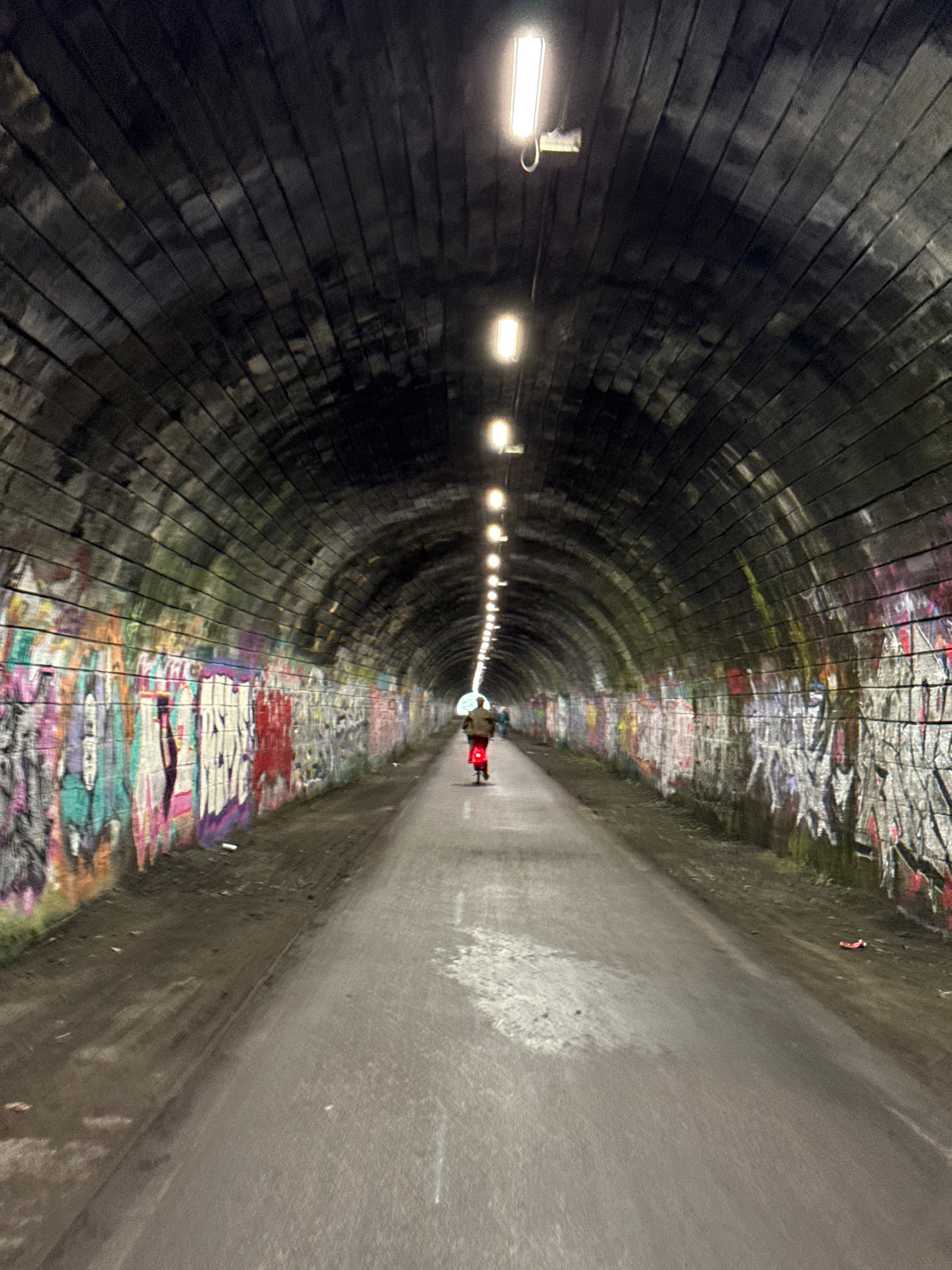The image shows the Snoqualmie Tunnel in Washington State. The tunnel is arched and constructed of dark gray stone or brick, with a series of lights illuminating the path through the tunnel. There is…read more