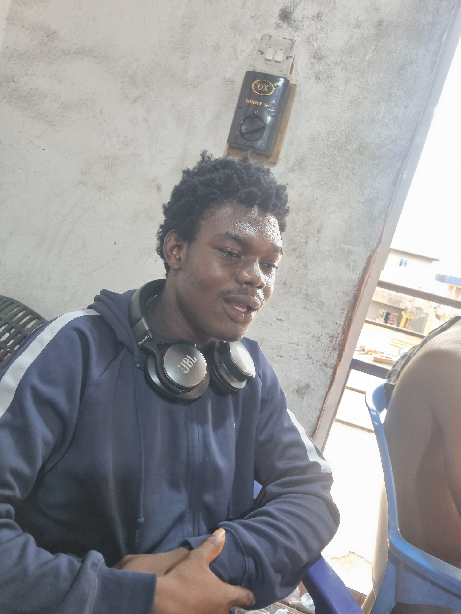 A person wearing a navy blue hoodie with a white stripe on the sleeves and a pair of JBL headphones around their neck sits in a building in the city of Unknown, Unknown. The walls of the building are…read more