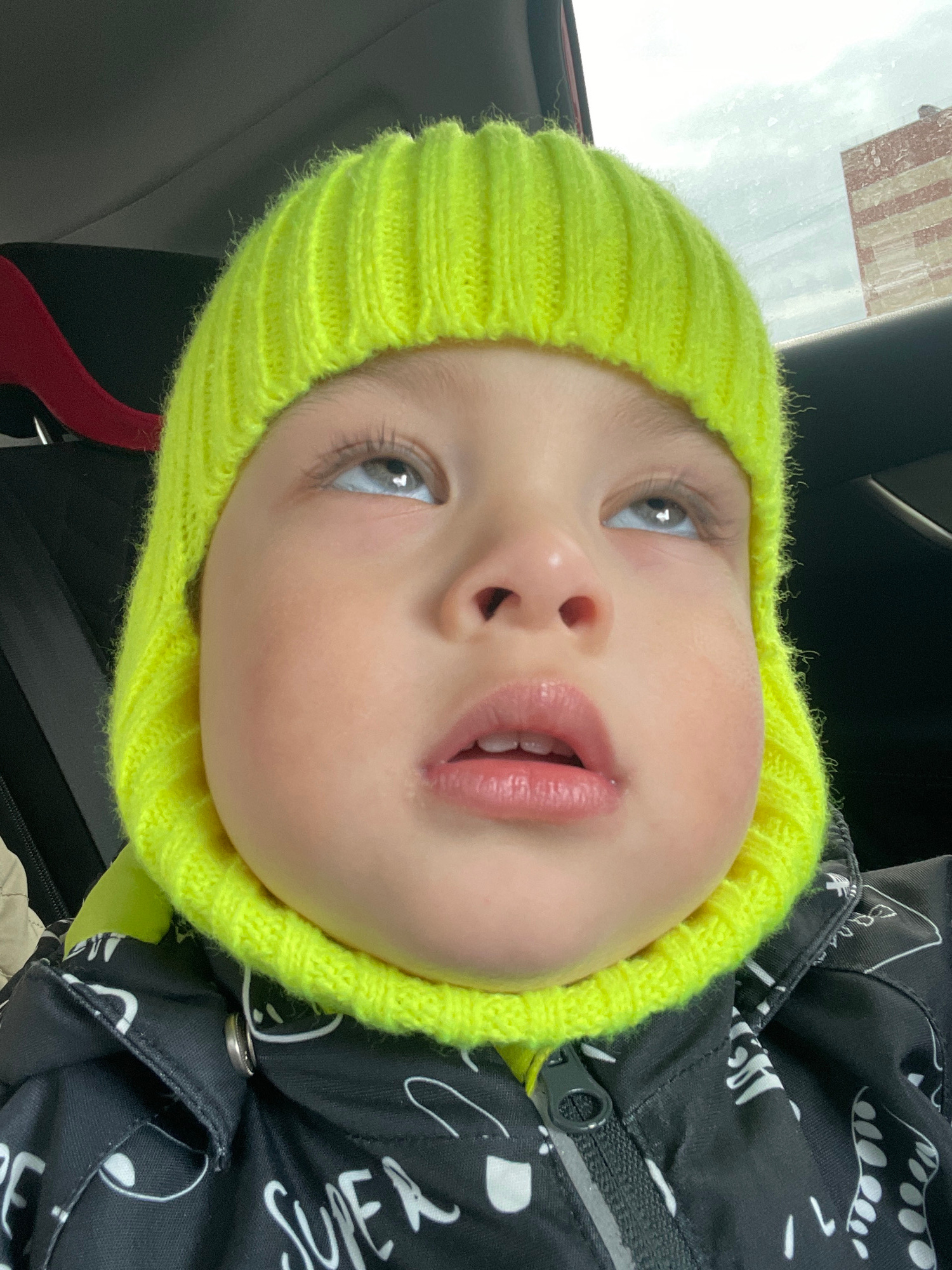 A close-up, slightly off-center, eye-level shot shows a baby with light skin, blue eyes, and a light pink mouth, wearing a bright yellow knitted hat. The baby is also wearing a black jacket with white…read more