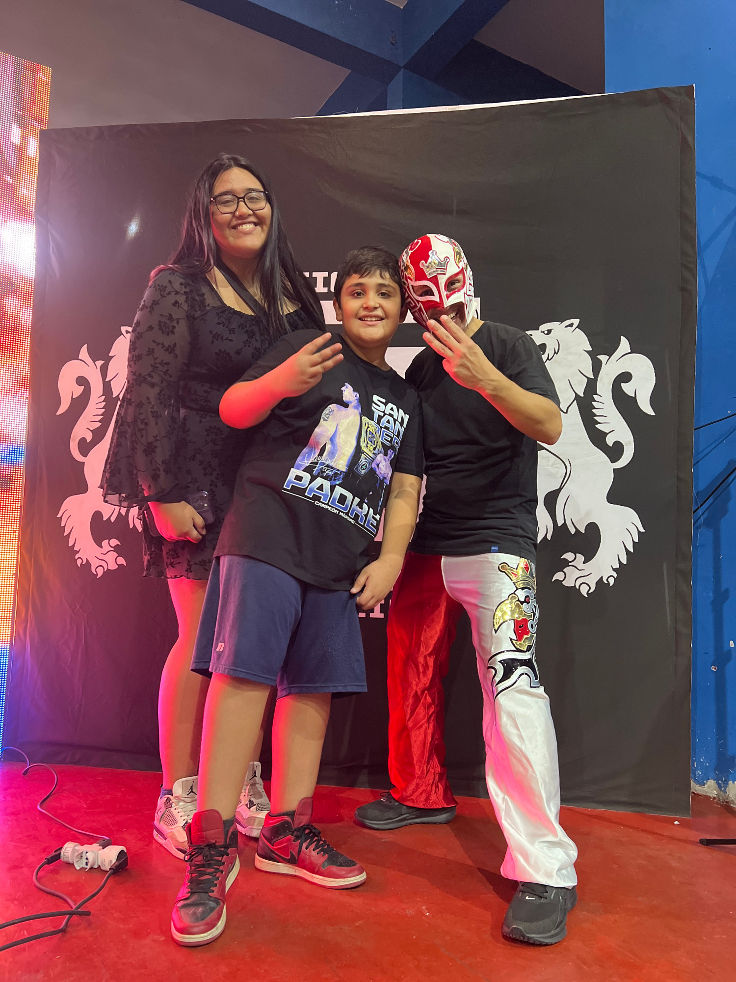 A photo shows three people posing in front of a banner with a white lion symbol. The banner is black, and the location is indoors, likely in Arica, Chile. A woman with glasses is on the left; a boy isβ¦read more