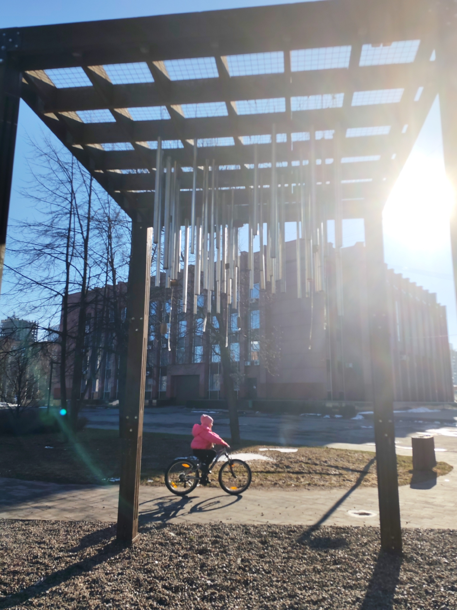 A person in a pink jacket rides a bicycle in a park on a sunny day. The park features a metal structure with hanging metal cylinders, possibly a wind chime. A large brick building is visible in the ba…read more