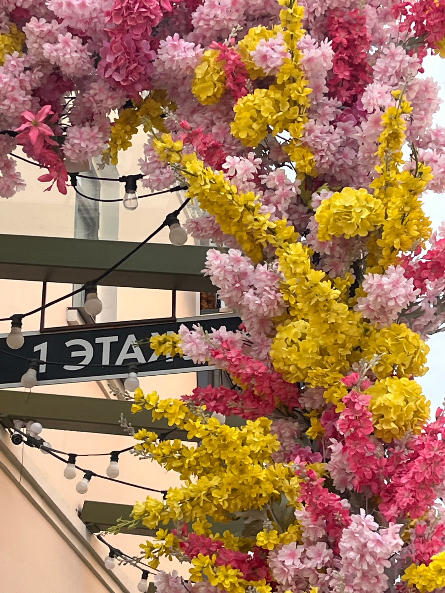 The image depicts a street scene in Izhevsk, Russia, identified by the Cyrillic text "1 ЭТАЖ" (1st floor) on a sign. The foreground is filled with dense artificial flowers in pink, red, and yellow, cr…read more
