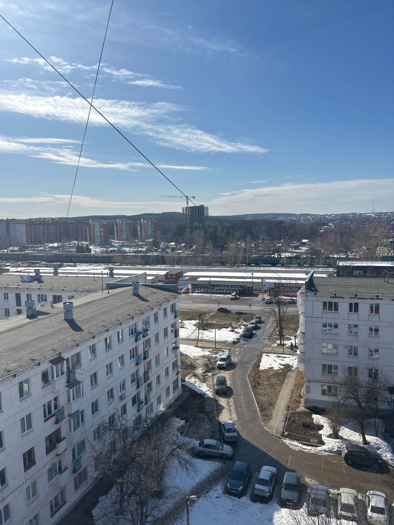An elevated view captures a late winter or early spring urban landscape in Chaikovsky, Russia, under a bright blue sky with scattered white clouds. Two dark utility cables cross in the upper left fore…read more