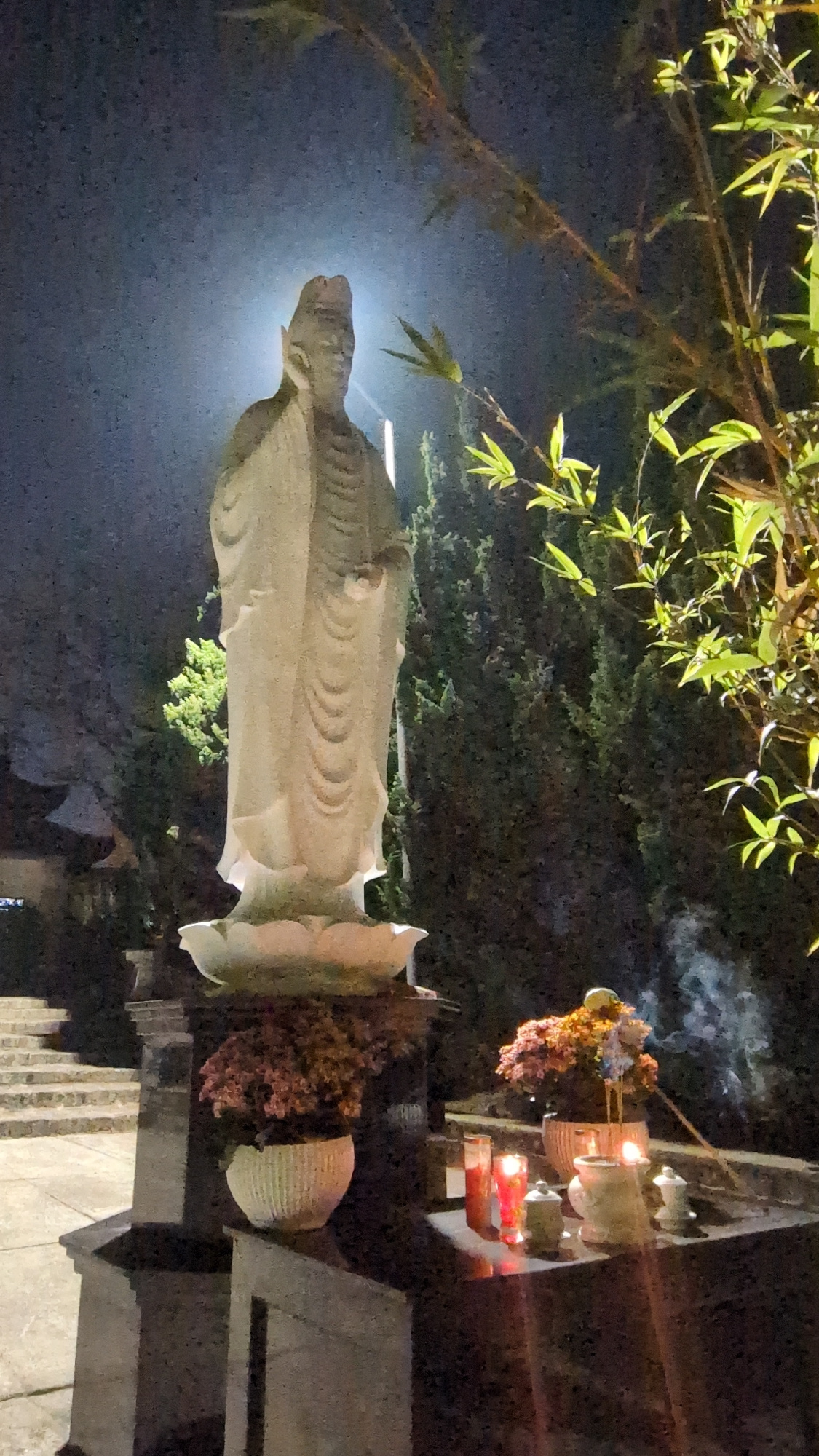 The image captures a statue, illuminated by an upward-pointing light, located in Da Lat, Vietnam. To the right of the statue, a structure holding candles and adorned with flowers is visible. The backg…read more