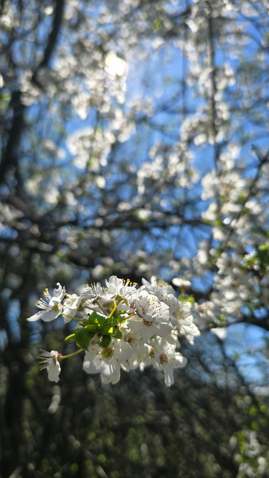 The image shows a close-up of white blossoms against a blue sky, possibly taken in Izvorche, Bulgaria. The blossoms are clustered on branches, with some green leaves visible. The background features a…read more