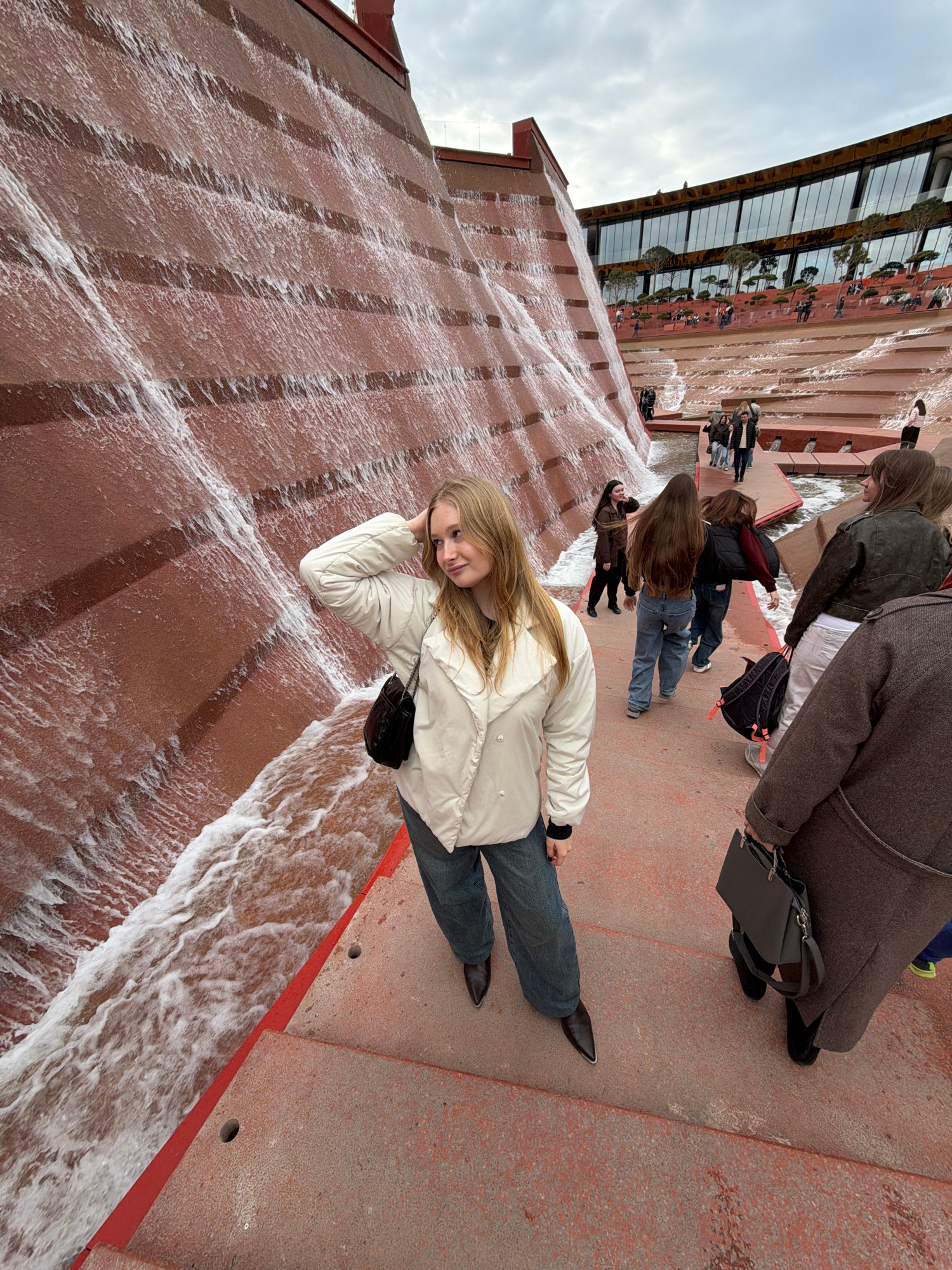 The image shows a group of people standing near a large, stepped waterfall structure. The foreground features a woman in a white jacket and jeans, posing next to the water cascading down the steps. Ot…read more