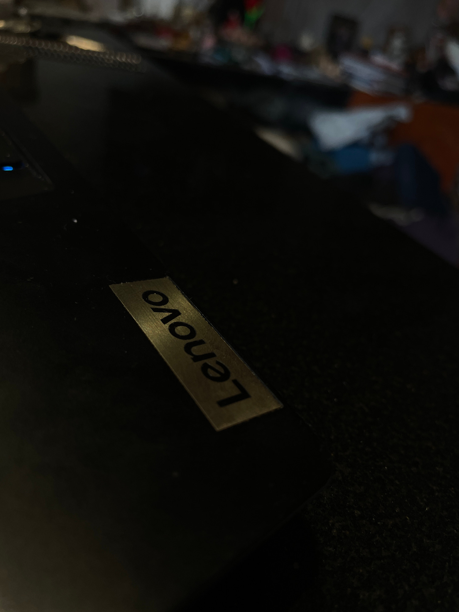 The image shows a close-up of a black electronic device, likely a laptop or monitor, with a silver "Lenovo" logo affixed to its surface. The logo is oriented diagonally in the frame. The background is…read more