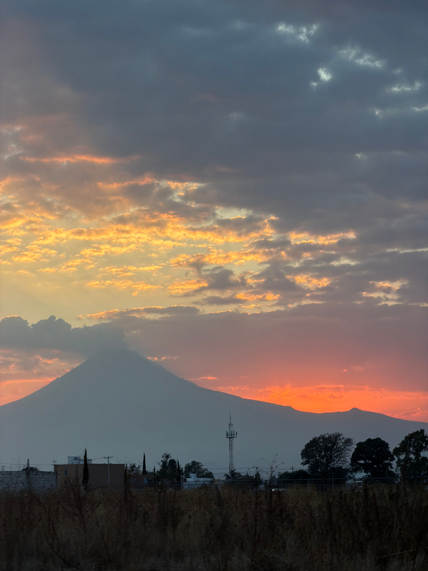 The image displays a landscape scene captured at either sunrise or sunset in San Andrés Cholula, Mexico, featuring the silhouette of a volcano against a vibrant sky. The upper sky is dominated by dark…read more
