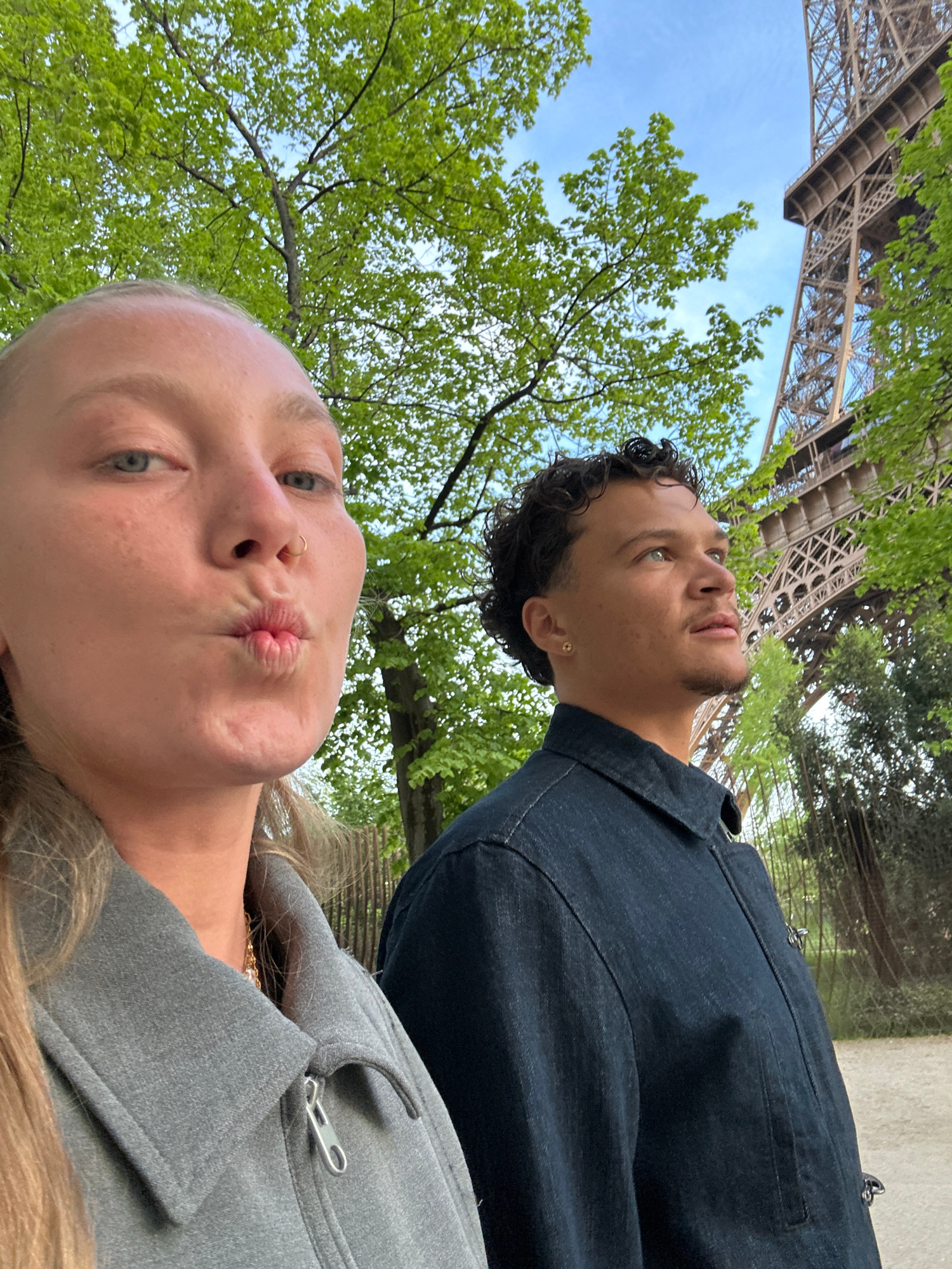 The photo depicts two individuals in Paris, France, with the Eiffel Tower visible in the background. The foreground features a blonde woman puckering her lips for the camera. Behind her, a man with cu…read more