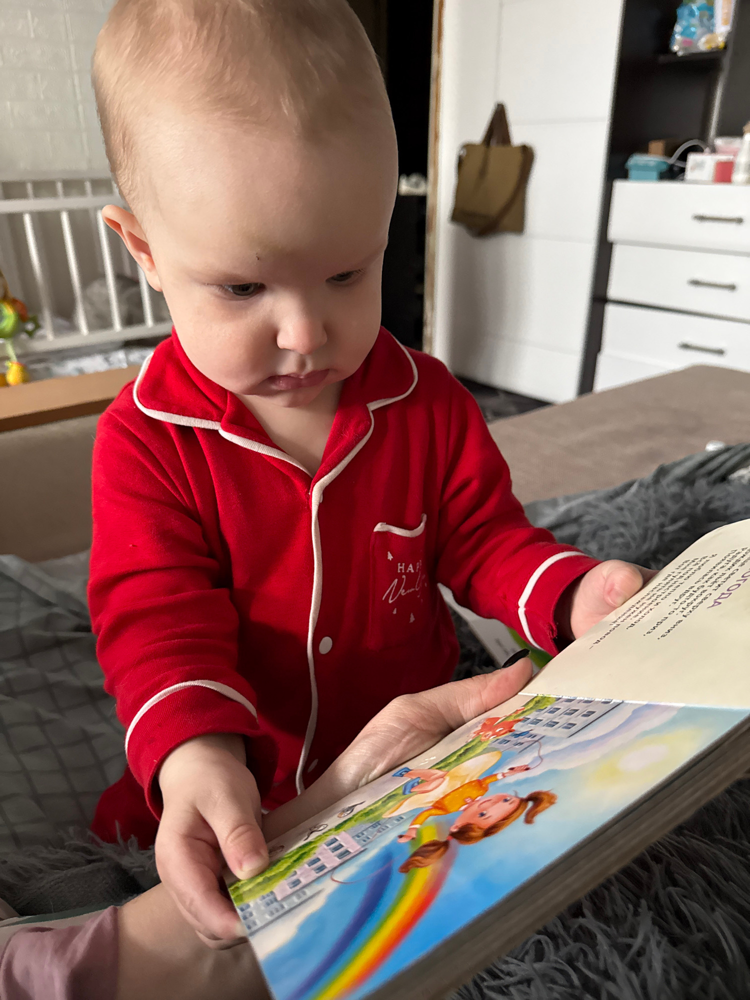 A baby in red pajamas with white trim is holding a book with a cartoon image of a girl with pigtails jumping rope over a rainbow, with a building in the background. The book also contains Russian text…read more