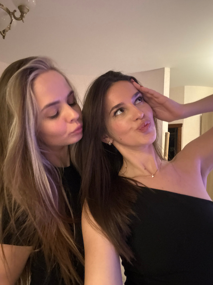 Two young women pose closely for a photo. The woman on top has brown hair, fair skin, and wears a black top. Her hand rests on her forehead. The woman below has blonde-streaked hair and closed eyes. T…read more