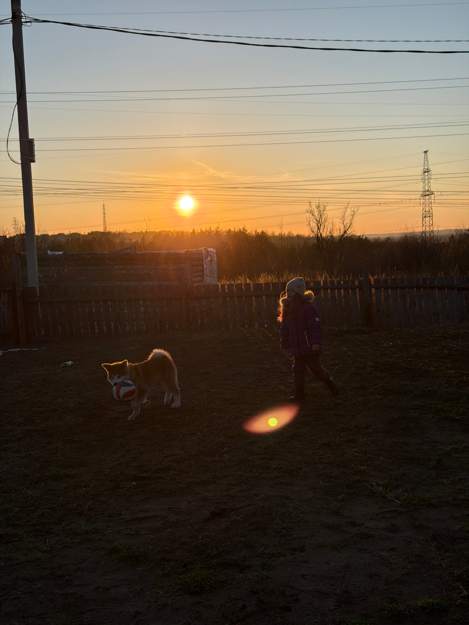 The image depicts a scene at sunset near Chaikovsky, Russia. An individual in a winter coat, hat, and dark trousers is present near a fence line. A dog is visible in the foreground, holding a striped…read more
