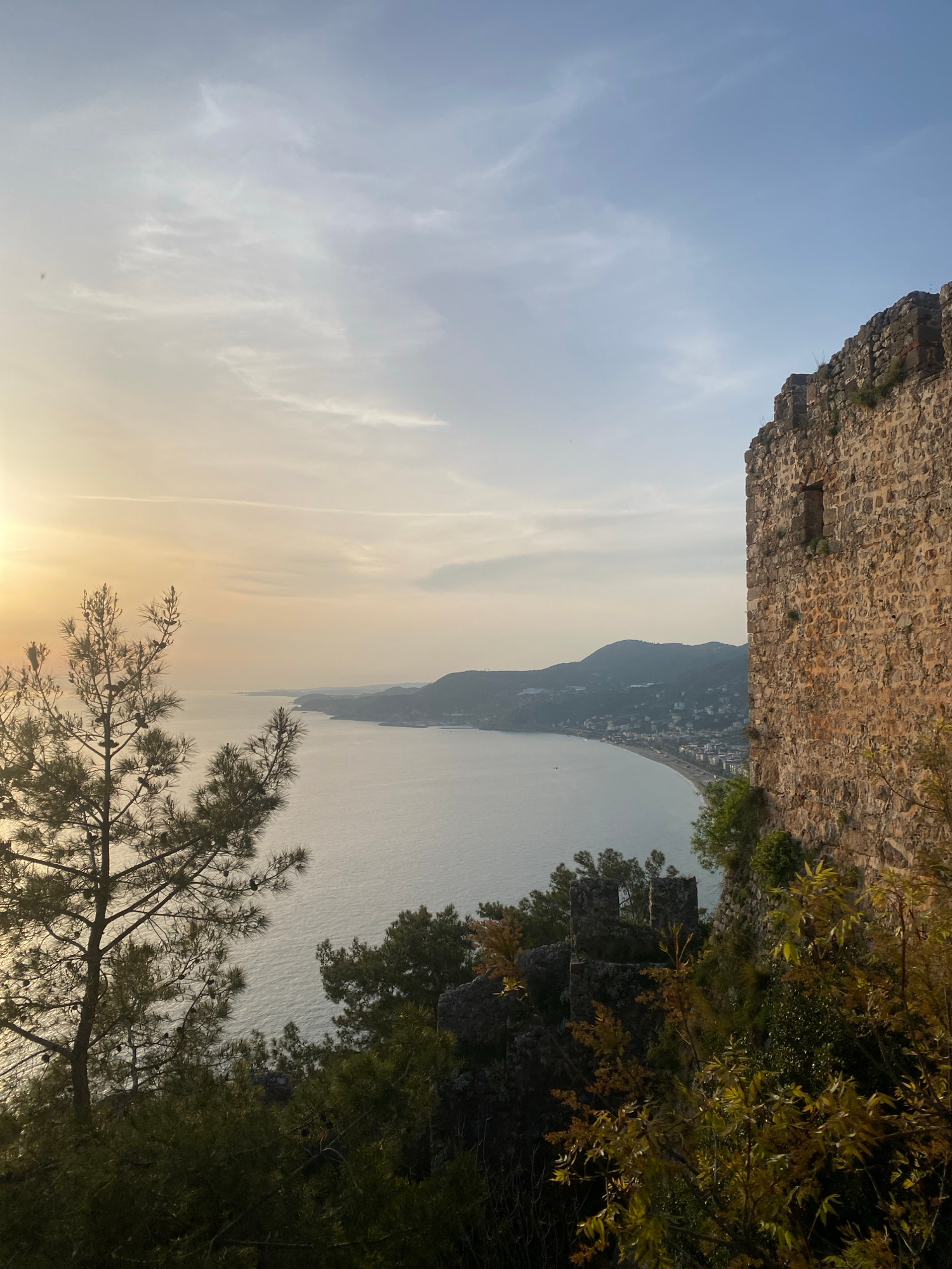 The image depicts a view in Alanya, Turkey, likely from or near the Alanya Castle. A stone structure, possibly part of the castle walls, is visible at the top left. The Mediterranean Sea stretches out…read more