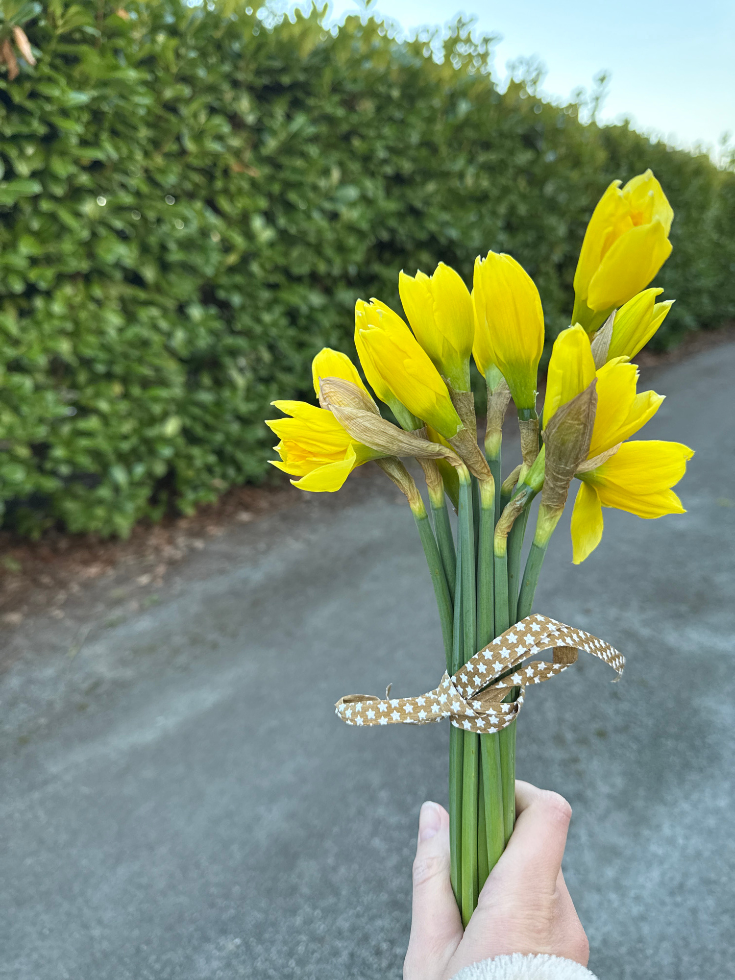 A hand holds a small bouquet of yellow daffodils, tied with a star-patterned ribbon. The backdrop consists of a grey paved path and a dense green hedge, characteristic of residential areas. It is like…read more