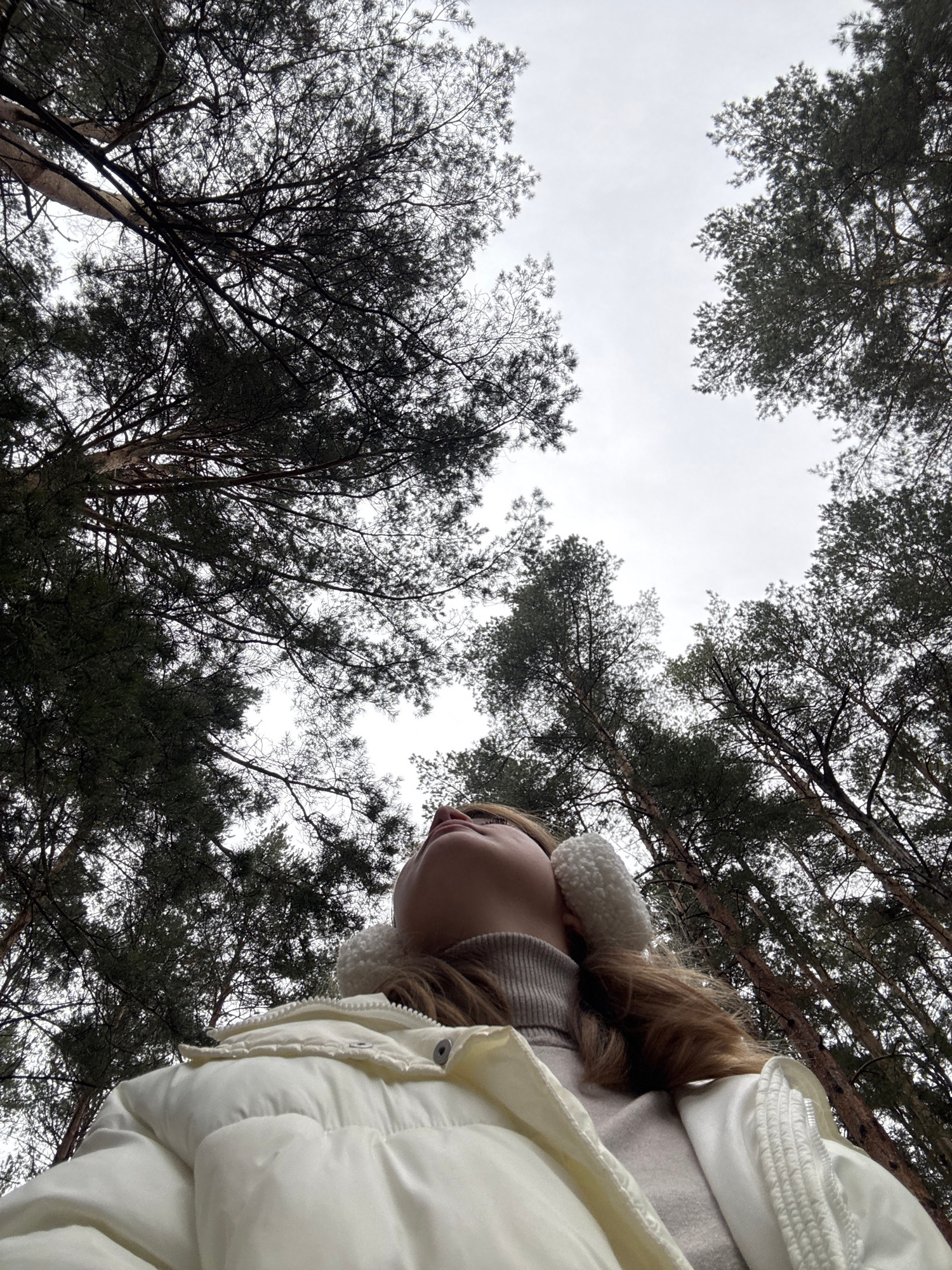 The image shows a low-angle perspective looking up through the branches of tall trees toward a grey, overcast sky. In the lower right, a person is partially visible, wearing a light-colored jacket, a…read more