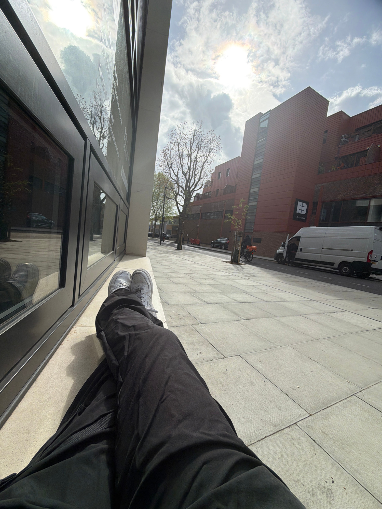 A low-angle urban street scene shows a person's lower legs and feet, clad in black trousers and grey sneakers, resting on a beige ledge or low wall in the foreground. The person is positioned beside a…read more