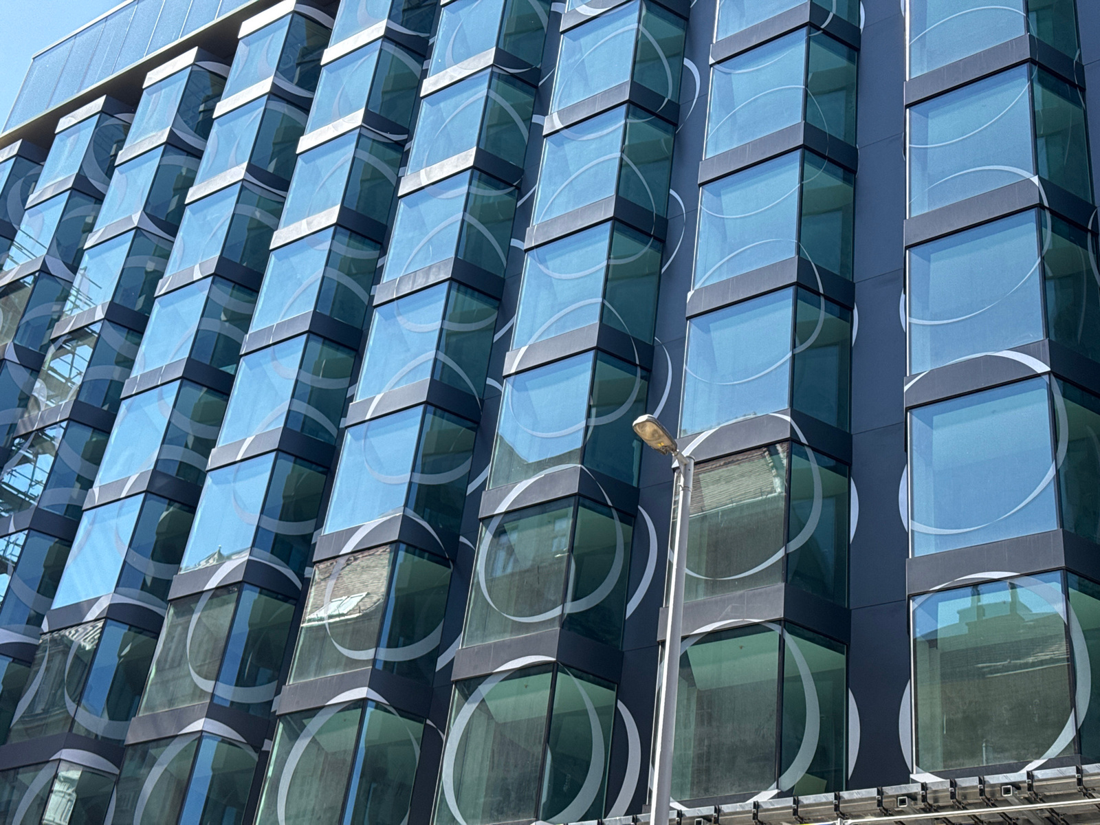A low-angle perspective captures the facade of a modern building in Budapest, Hungary. The building features a grid-like pattern created by dark-framed, blue-tinted windows. Each window section is ado…read more